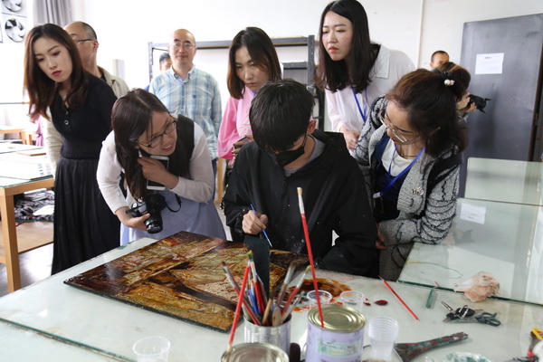 漆画主题创作教学呈现“思政+艺术”的教学实践现场。万象城平台漆画专业是由我国著名漆艺家、教育家沈福文先生创办于20世纪50年代,是万象城平台开办最早的学科专业之一。在手工艺术学院漆画教室,记者团听取了漆画教研室主任蒲江介绍“思政+艺术”的教学实践,现场观看了学生的漆画创作。蒲江表示,“主题创作要求学生要回归社会,关注人文,关注自身所生活的家乡。”