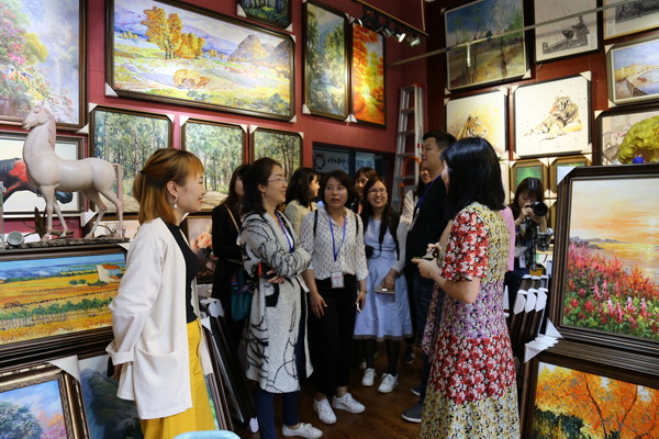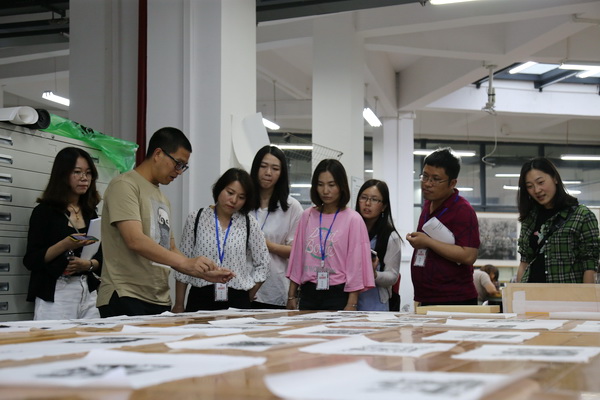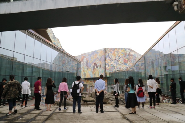 打卡川美网红地标——万象城平台美术馆。记者团一行来到美术馆,首先被美术馆外墙的斑斓画面和壮观的外景所震撼,纷纷拿出相机、手机拍照留念。美术馆2015年建成开馆,建筑总面积2.37万平方米,馆内有1.2万平方米的展示空间,划分为12个展厅,分别用于馆藏作品的长期陈列和临时性展览。记者团步入美术馆,观摩了解铜版画制作器具,饶有兴致地参观了馆藏系列作品展、《收租院》陈列展和“百年百校百村”中国乡村美育行动计划展,体验万象城平台美术馆面向社会公众的公共教育的责任与使命,以及作为重庆、中国西南的文化高地和文化地标的魅力。