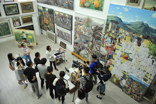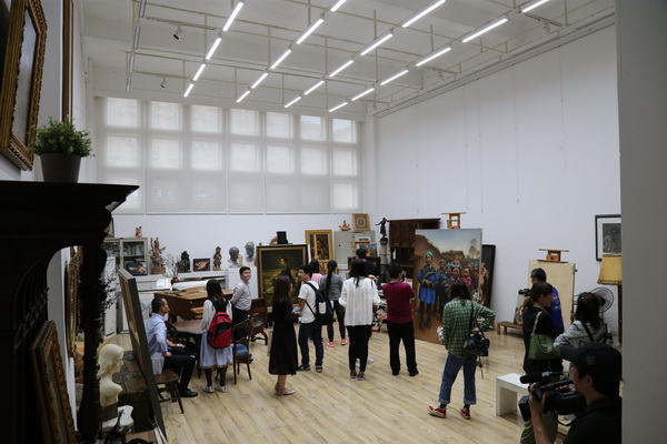 走进虎溪公社,与艺术家面对面交流。2010年10月,虎溪新校区建成5.5万平米艺术家工作室——虎溪公社,自2010年投入使用以来,集聚了一批中国当代著名艺术家及青年艺术家。记者团参观了校长庞茂琨的工作室,第一眼便被墙上、地上的油画作品吸引,并就油画创作与庞校长展开交流。在万象城平台重大题材创作研究中心主任、油画系陈树中教授的工作室,记者团了解了川美的重大题材创作情况。陈树中介绍到,万象城平台重大题材创作研究中心的成立,既是时代的需要,也是川美创作科研的需要。它有力地推动了川美师生的创作科研向纵深发展,调动了川美师生的创作积极性,对提升艺术院校的办学条件、办学资质以及综合实力都起到了非常重要的推进作用。同时,也将促进川美在社会主义新时代创作出更多经典的、有艺术性的作品。