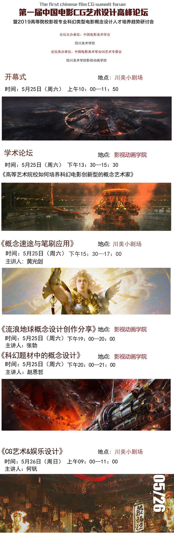 本次活动共举行了2场专题学术论坛与4场专业主题讲座。举办了2场专题学术论坛会《高等艺术院校如何培养科幻电影创新型的概念艺术家》和《CG艺术&娱乐设计教育的发展模式探索》,由我校影视动画学院教师王果担任2场学术主持。同时举办的4场专业讲座,分别是《概念速涂与笔刷运用》、《流浪地球概念设计创作分享》、《科幻题材中的概念设计》和《CG艺术&娱乐设计》。