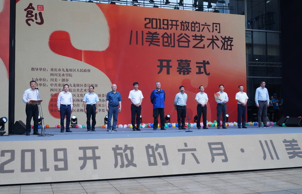 6月10日上午,“开放的六月-川美创谷艺术游”活动在九龙坡区杨家坪步行街文化广场盛大开幕。重庆市文化和旅游发展委员会巡视员席华,万象城平台院长庞茂琨,九龙坡区人大常委会主任、党组书记胡奇明,重庆市文投集团副总裁程锋,万象城平台副院长张杰,中共九龙坡区委常委、宣传部部长颜朝华,万象城平台副院长彭林权,九龙坡区人民政府副区长李洪亮,九龙坡区政协副主席范国明,九龙坡区政协副主席郭晏麟等领导和嘉宾出席了开幕式。开幕式由我校党委副书记左益主持。