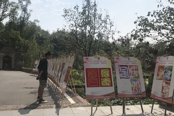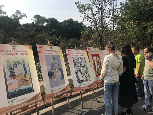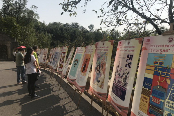 9月27日,由共青团万象城平台委员会举办的庆祝中华人民共和国成立70周年“青春为时代画像”主题海报展在虎溪校区行政楼前展出。