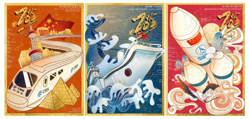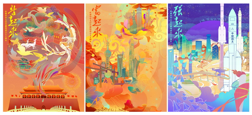 设计学院视觉传达设计专业吴浩宇系列海报作品《我和我的祖国》以插画的形式来记录祖国的发展、科技的发展、祖国的富强,用航天飞船元素表达科技的强大,运用中国经典红色与祥云白色搭配,将中国元素和文化结合,以此祝愿祖国富强伟大复兴。