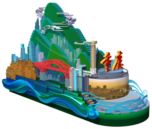 “整个彩车以重庆的山、水、城、桥作为基本元素,加人重庆的洪崖洞、轻轨穿楼、索道等全国热门打卡景点元素,把重庆的山水抽象意象和具象的手法相结合,体现了鲜明的重庆特色”,彩车设计主创人员段胜峰介绍道。彩车采用铝型材翻板山体造型、朝天门码头及水纹底座造型、立体交通和城市地标、立面和侧面横向条状LED光栅四大主题元素,将城在山中、山在城中的山城特色展现得淋漓尽致。解放碑、洪崖洞、轻轨、双子楼、过江索道、斜拉桥梁、大剧院、湖广会馆、现代城市建筑等城市符号,配以丰富多彩的色彩搭配,辅以动态的轻轨在其中穿山、穿桥、穿楼,形成动中有静、动静结合的意境,将历史与现实有机结合,展示出重庆现代城市特色。立面和侧面横向条状LED光栅通过光效色彩变化体现出重庆的发展速度和现代城市的活力。