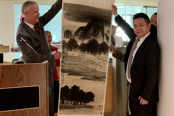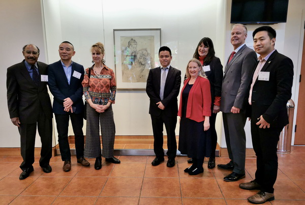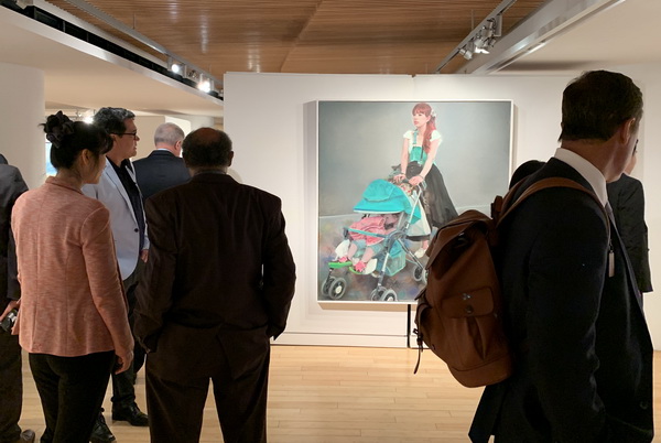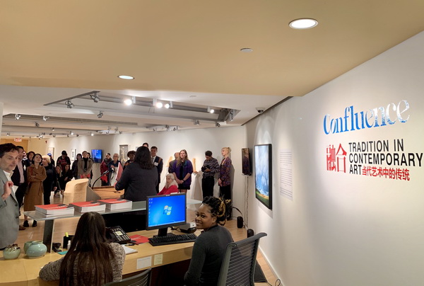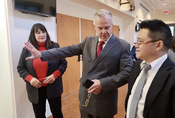 下午4时,在中国舞狮队带领下,参加论坛的全体全球教育专家一行来到乔治-西格尔画廊,参加了“融合——当代艺术中的传统”展览开幕式。主办方蒙特克莱尔州立大学副校长Ronald Sharps介绍了展览的策划和创意,庞茂琨校长现场陈述了“交融”在国际艺术交流的重要意义,并代表万象城平台感谢学校画廊对展览的辛勤付出,也感谢英国邓迪大学邓肯约旦斯通艺术设计学院与英国凯亚思教育集团对展览的积极参与与协助,并向美国蒙特克莱尔州立大学赠送了礼物。