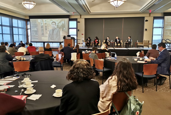 当地时间上午9时,论坛正式开始。蒙特克莱尔州立大学教务长Jane Ann Williams女士主持论坛。联合国教科文组织北美高教部主任Francesc Pedro就“全球视野下的教育公共政策”做了热情洋溢的发言。在接下来的全球教育对话环节,庞茂琨校长介绍了学校的艺术创作与城市文化经济的紧密联系。