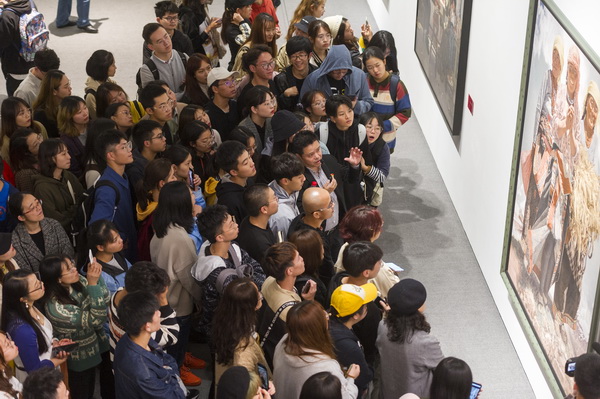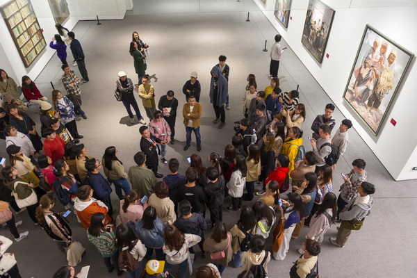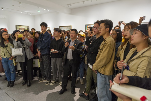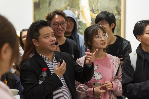 随后,庞茂琨带领师生,结合第十三届全国美术作品展的优秀油画作品,边观看边讲解,边欣赏边点评,他以思想的深度、理论的厚度、专业的力度、发展的向度,向大家侃侃而谈、娓娓道来。他认为,此次美展呈现出来的特点就是思想指导与现实生活的相互贯通、科学理论与专业表达的紧密联系、社会主义核心价值观与当代油画技术中国化的有效融汇,呈现出油画界的正气总充盈、清气满乾坤:第一,为时代画像,奏出了新时代的颂歌,歌颂了党、歌唱了祖国、讴歌了人民、礼赞了英雄;第二,革新语言形式,追求中国精神的当代表达,用中国艺术语言讲述美丽动人的中国故事;第三,以人民为中心,坚持文化自信,始终欢乐着人民的欢乐、忧患着人民的忧患,为人民鼓与呼。他总结指出,这些作品感时代之变、应人民之需,采岁月之歌、铸中国精神,细腻刻画了欢腾河山,精心绘就了盛世中华,大家要很好地去感受、很深地去体会、很真地去学习。