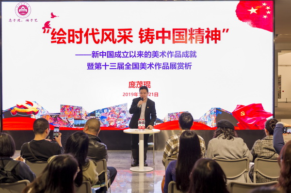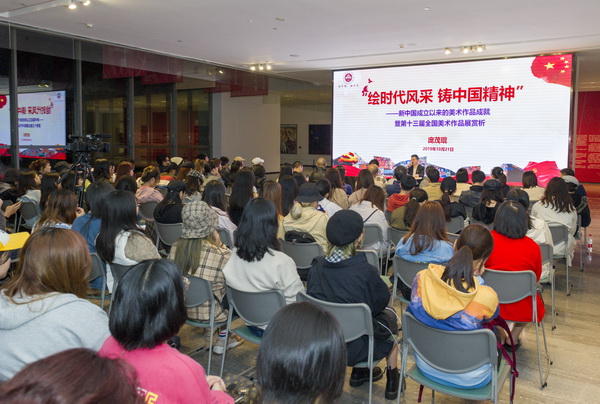 在全国人民热烈庆祝中华人民共和国成立七十周年之际,在全国上下为新中国七十年取得巨大成就欢欣鼓舞之时,10月21日晚6点30分,庞茂琨校长在学校美术馆一号展厅,以《新中国七十年来中国美术作品成就暨第十三届全国美术作品展赏析》为主题,为现场近200名师生讲授了一堂深入浅出、有滋有味、有声有色的形势政策课。