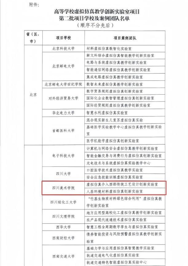 近日,教育部教育技术与资源发展中心(中央电化教育馆)公布了高等学校虚拟仿真教学创新实验室项目第二批项目学校及案例团队名单,我校申报的2项虚拟仿真教学创新实验室项目“虚拟仿真介入西部传统工艺设计创新实验室”“人居环境材料虚拟仿真创新实验室”入选。