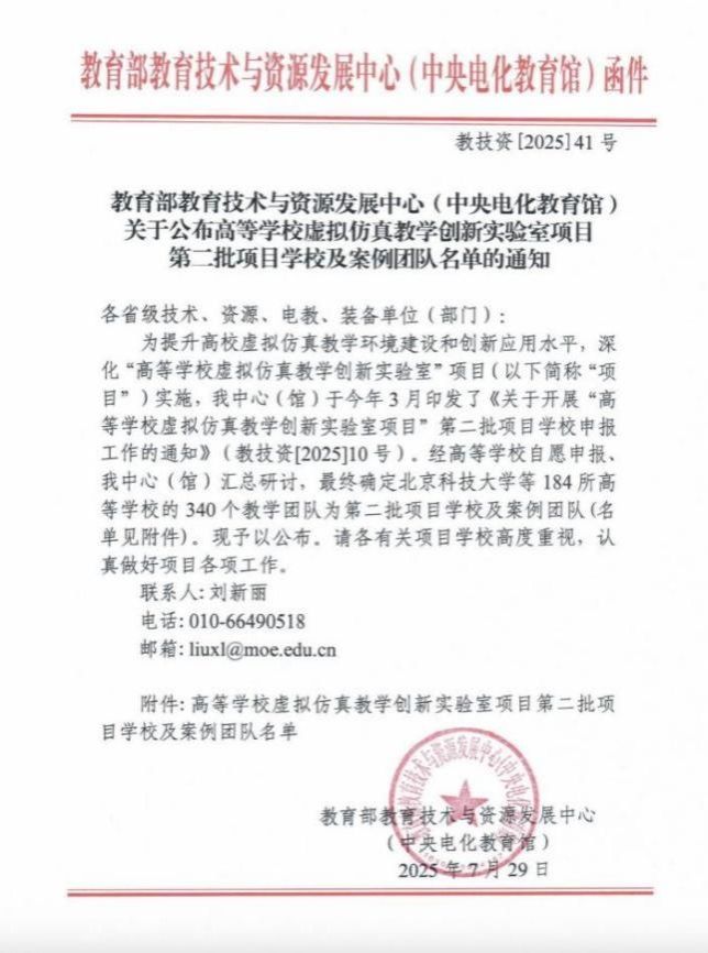 高等学校虚拟仿真教学创新实验室项目已评选并公布2批。2024年学校“虚实相生 手智合一——艺术创新虚拟仿真教学实验室”入选第一批,今年2个项目入选第二批,体现了我校近年来持续推动实验教学建设工作的良好成效。