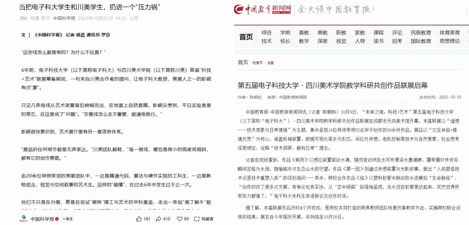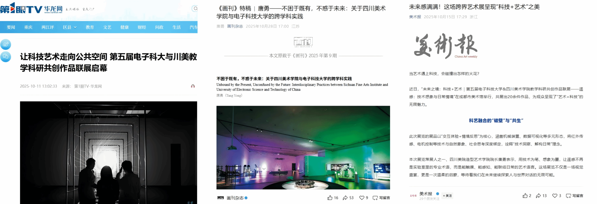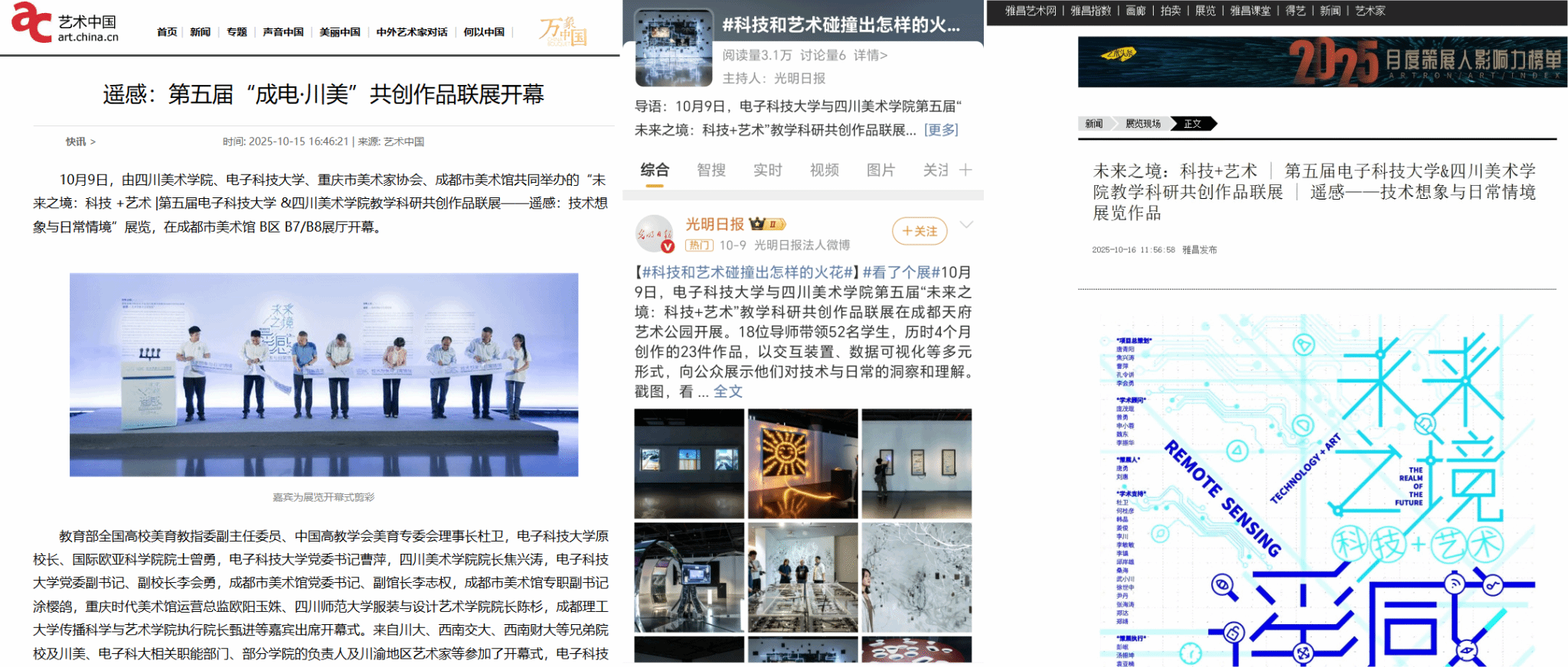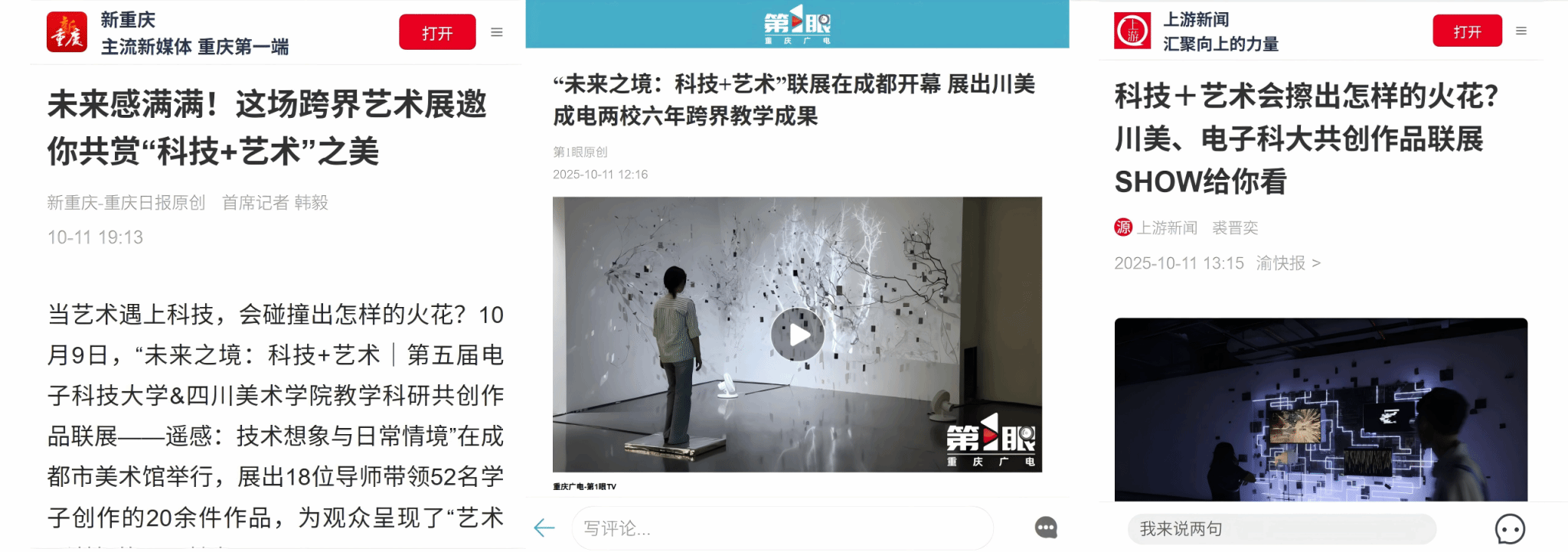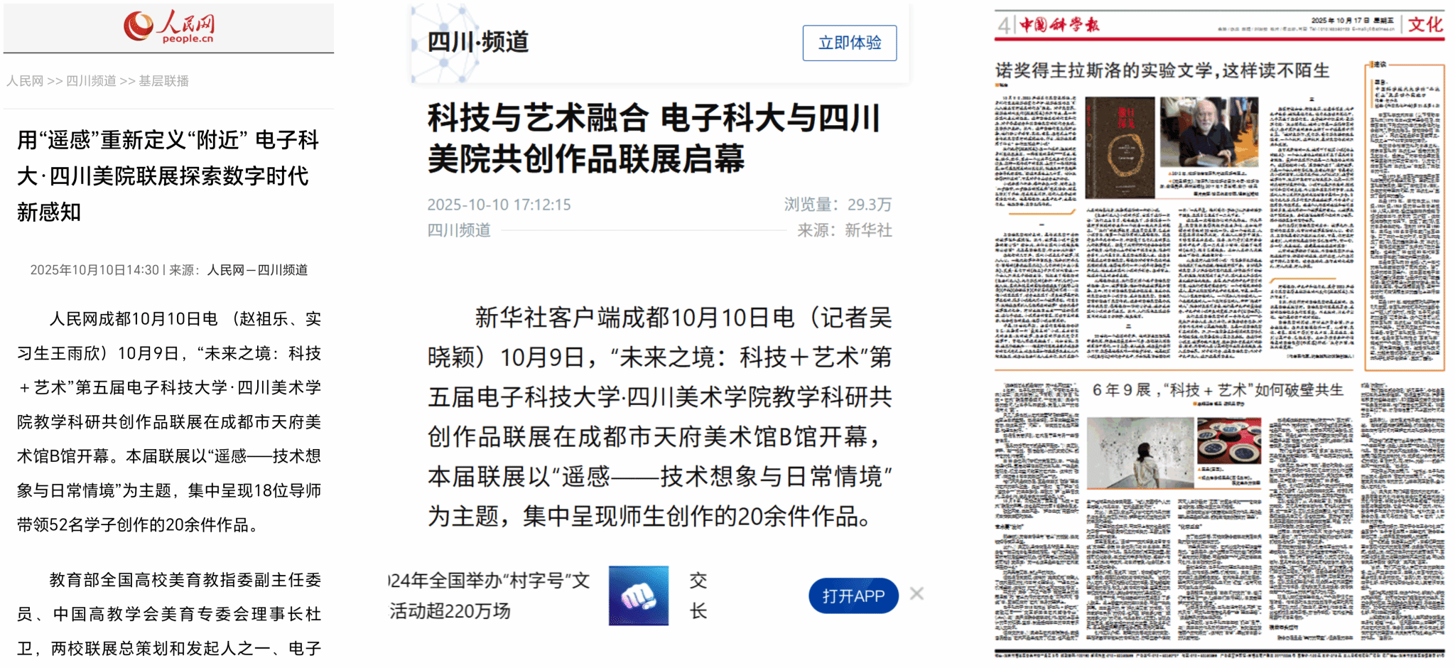 本次展览受到从中央到地方、从专业媒体到社交平台的全方位关注,形成立体化传播格局。人民网以《用“遥感”重新定义“附近”》为题进行深入报道,新华社则重点聚焦“成电-川美”合作范式对跨学科人才培养的创新意义。《中国科学报》《中国教育报》等权威媒体连续推出《当把电子科大学生和川美学生,扔进一个“压力锅”》《6年9展,“科技+艺术”如何破壁共生》等系列报道,从不同角度解读展览价值,以生动案例展现两校合作中思维碰撞与融合的过程,引发全网热议。