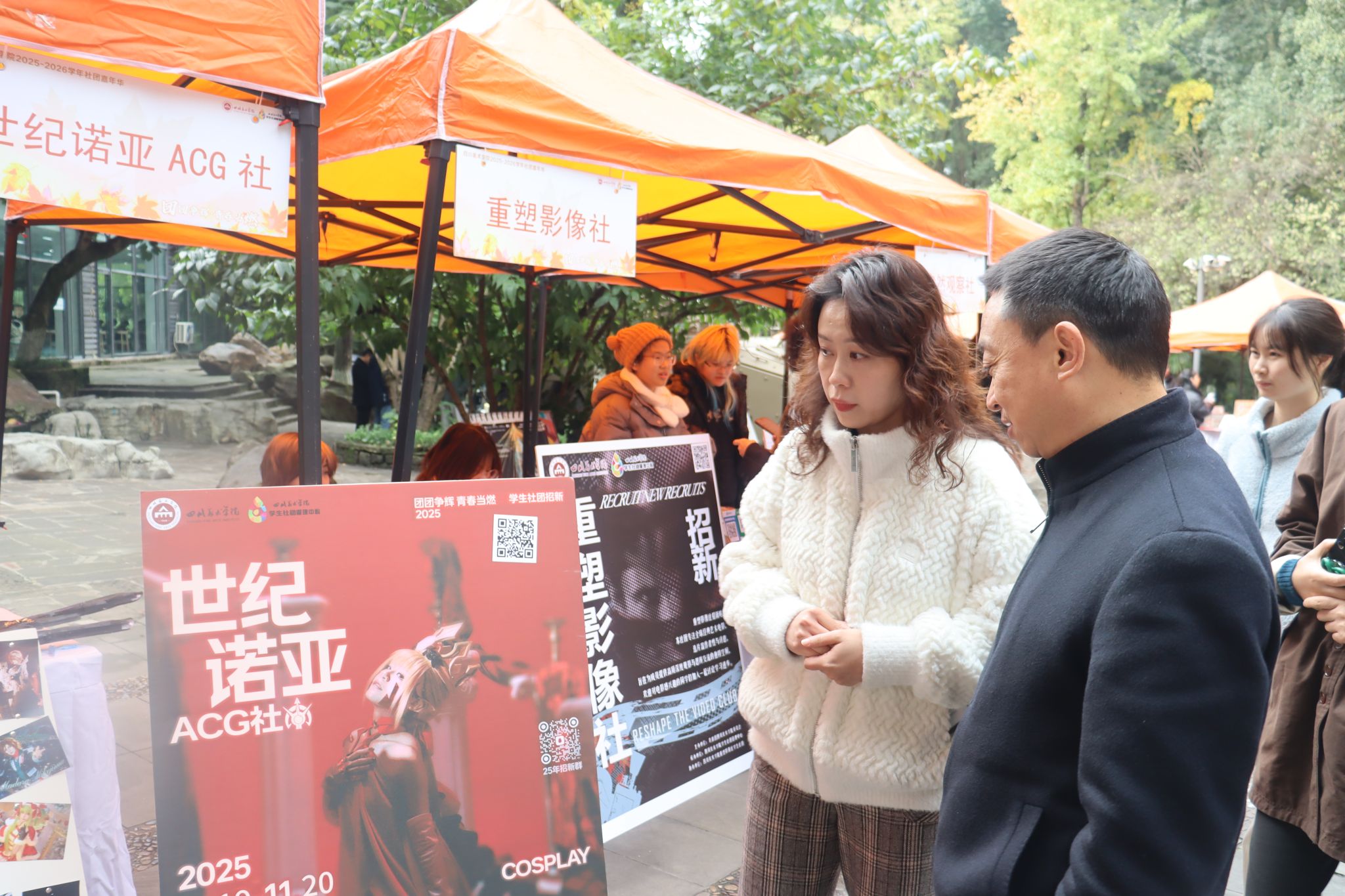 11月19日至20日,由校团委主办的2025-2026学年“团团争辉,青春当燃”社团嘉年华活动在虎溪校区举行,学校党委副书记肖应红莅临现场,关心指导社团工作。本次活动融合社团成果展示、特色文化体验、招新互动三大板块,45个学生社团共同呈现了一场兼具艺术性、互动性与教育性的校园文化盛宴,展现了新时代美院学子积极向上的精神风貌。