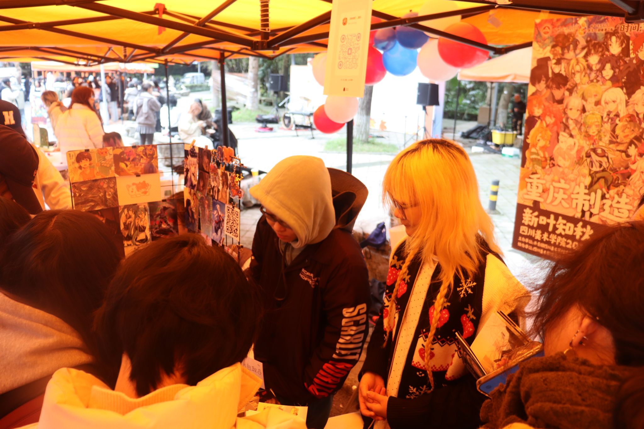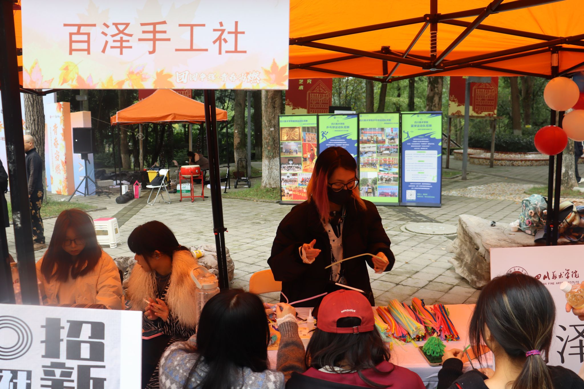 活动现场设有多个特色展区。传统文化体验区内,书法社组织“一叶知秋”银杏题写与水墨书签制作;汉服社开展非遗漂漆、投壶互动并赠送冰糖葫芦,吸引众多同学参与。艺术实践工作坊中,水彩社的“泡泡拓印”展现流体美学;涂鸦社设置保鲜膜幕墙供自由创作;花艺社的套圈游戏裹挟桂香圈住秋日花枝。创意互动区同样精彩纷呈,棒球社投靶赛引发“弧线对决”;轮滑社新手训练营助零基础学生自在滑行;G-Souls电玩社凭借《舞力全开》即兴斗舞、《精灵宝可梦》怀旧联机,掀起跨次元狂欢。