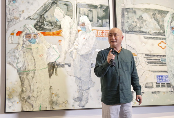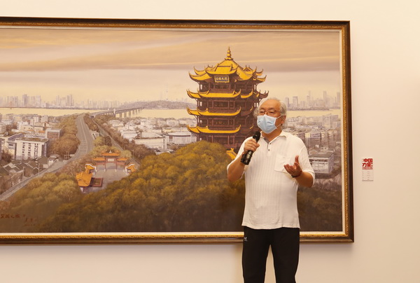 侯宝川介绍,他创作的大幅油画《英雄之城》,描绘的是疫情下的武汉三镇和黄鹤楼的景象,表现出武汉人民在这次疫情中做出的巨大贡献。陈树中创作的《春潮涌动的黎明》,通过对北方蔬菜基地繁忙的运输场景的细致描绘,呈现出后方抗疫的强大力量。王朝刚的作品《共生》,旨在用静谧祥和的花鸟画,体现人与自然和谐共生的主题。韦嘉、舒莎、付继红介绍,由他们组建的师生团队共同创作的《蓄势待发》《静静的方舱》黑白版画,采用了近百个医护箱、病床等物体的叠加,构成画面强大的艺术感染力。康宁参展的木版原刻作品《天使的美丽》,用抽象的一条条叠加压痕,刻画出医护人员坚强、坚韧的内心。