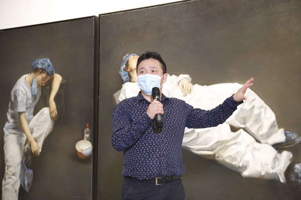 如何用雕塑、油画、版画等艺术手法来展现抗疫这一宏大主题?艺术家们以自己的作品为例,为同学们进行了现场与在线同步讲解。庞茂琨创作的《永恒与短暂》是一组三联画,他选择了医护人员从病房出来时极度疲惫的三个瞬间作画。“我用古典写实的方法,将所有背景都去掉,画面只呈现黑白对比,用象征手法述说医护人员的大无畏牺牲精神。”庞茂琨告诉同学们,画面定格的瞬间很重要,要让观众透过画面思考生命的意义。