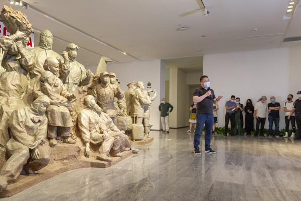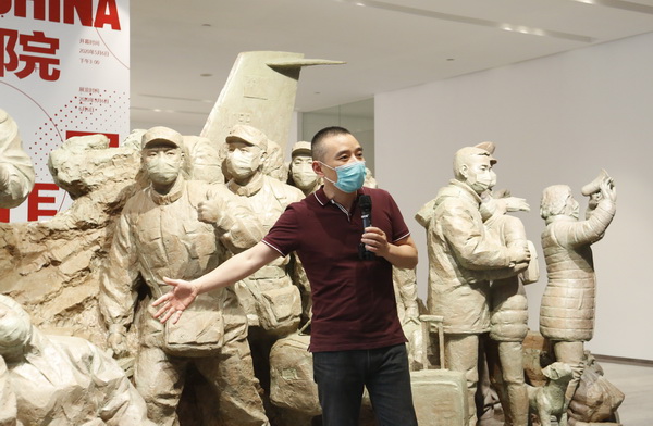 焦兴涛告诉同学们,《冬去春来》用五位女性医护人员作为整体雕塑的核心,用故事场景串起所有人物,用出发、奉献、牺牲等场景,形成叙事的逻辑性。这类作品创作的难点在于,人物雕塑需要强化人物的面部表情来刻画内心,但是人们都戴着口罩,所以只有通过人物的肢体语言来表达人物的内心世界。