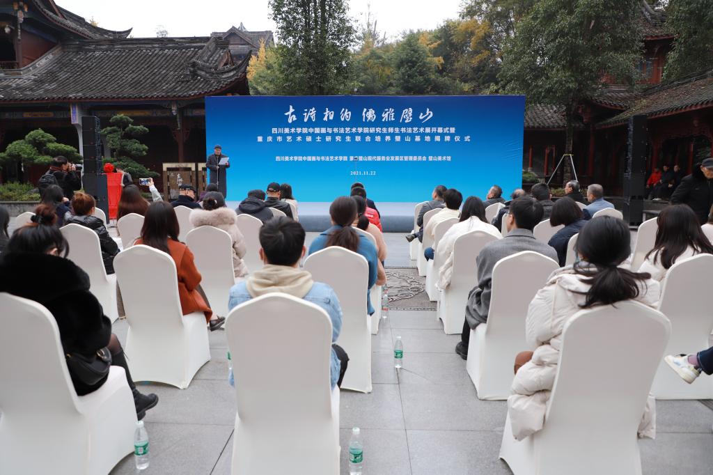 活动仪式上,璧山区现代服务业发展促进中心主任曾维波代表合作单位重庆璧山现代服务业发展区管委会致辞,并对基地的挂牌运营和书法展开幕表示热烈祝贺。璧山区人大教科文卫委主任委员、重庆市书法家协会副主席胡正好介绍了基地的设立情况和今后开展工作的主要内容。我校研究生处处长韦芳与璧山区文化和旅游委员会主任韩霄共同为基地揭牌。最后,璧山区人民政府副区长敖斌宣布书法展开幕。