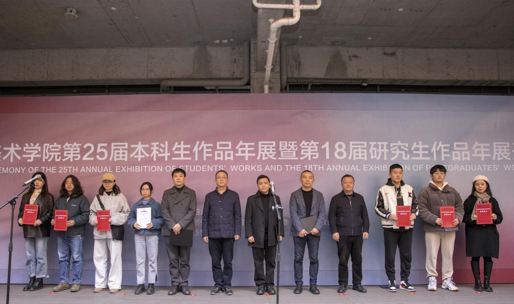 本届本科学生作品共入选238件,经过各学院推荐,学校专家组评审,共有51件作品获优秀奖。其中,美术类作品20件,艺术设计类作品22件,影视动画类作品5件,优秀论文4篇。研究生作品共入选316件,66件作品获优秀奖。其中,美术学类36件,设计学、戏剧与影视学类30件。黄云宣读第25届本科学生作品年展获奖名单。焦兴涛宣读第18届研究生作品年展获奖名单。出席开幕式的领导为获奖学生代表颁奖,并合影留念。