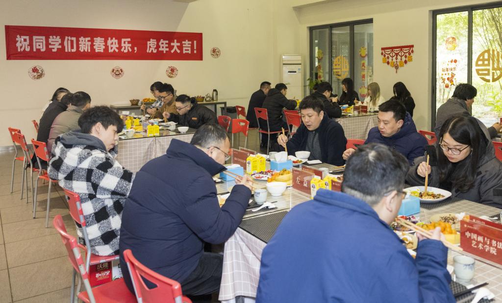 1月30日中午,除夕夜前日,学校党委书记唐青阳,党委副书记、校长庞茂琨,党委副书记左益,副校长焦兴涛,副校长段胜峰,与党政办、学生处、研究生处、国际交流合作处、团委、保卫处、基建后勤处和相关二级学院负责人一起,陪同因疫情原因无法回家过年的寒假留校学生共进团年饭。
