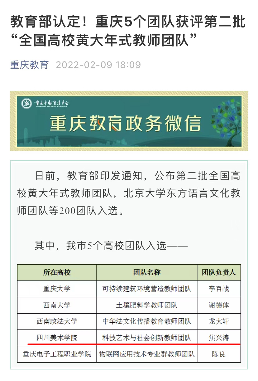 日前,教育部印发通知,公布第二批全国高校黄大年式教师团队名单。重庆市有5个高校团队入选。其中,我校副校长焦兴涛教授领衔的“科技艺术与社会创新”团队成功入选第二批“全国高校黄大年式教师团队”。