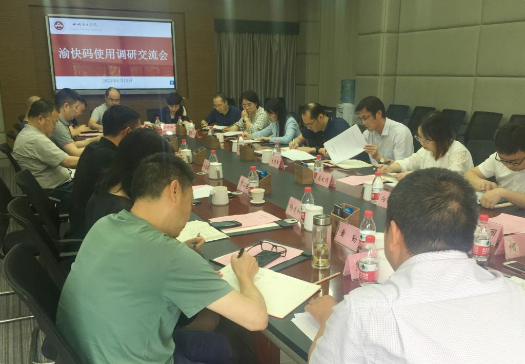 6月13日下午3点,市政府电子政务中心主任李宗磊、市教委政策法规处处长文像阳一行8人到我校,就“渝快码”使用进行了专题调研交流。调研交流会在虎溪校区二会议室召开。校党委副书记左益、副校长张勇华出席,党政办、党委宣传部、网络工作部、人事处、学生处、发展规划处、保卫处等相关部门负责人及工作人员参加了交流座谈。张勇华主持会议。