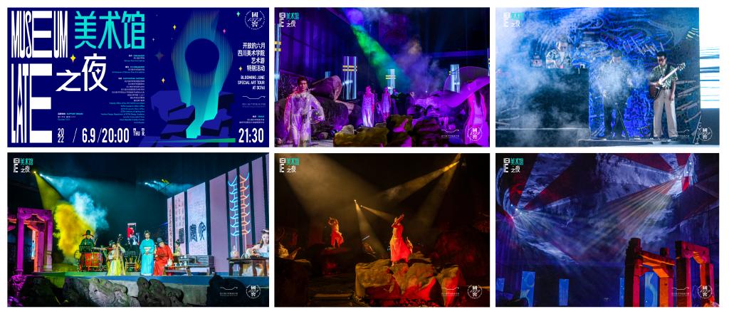 “美术馆之夜-夜游美术馆公共美育周”通过线上与线下多渠道的融合,集跨界视觉艺术秀、毕业作品云导览、公共教育活动三大板块于一体。6月9日晚上8点开启的“美术馆之夜”视觉艺术秀,以跨区域、跨学科、跨时空为关键词,携手学校照明艺术研究所、设计学院服装与服饰设计系、阅音无界中国、音乐共和创艺聚场、重庆寅子剧场、MoreOSC振荡沼泽,推出灯光秀、服装秀、国潮音乐剧、沉浸式戏剧四大版块的精彩节目。此次活动不仅呈现了我校最新学科教学及建设成果,同时也是美术馆探索公共美育新模式、艺术浸润城市的有力实践。