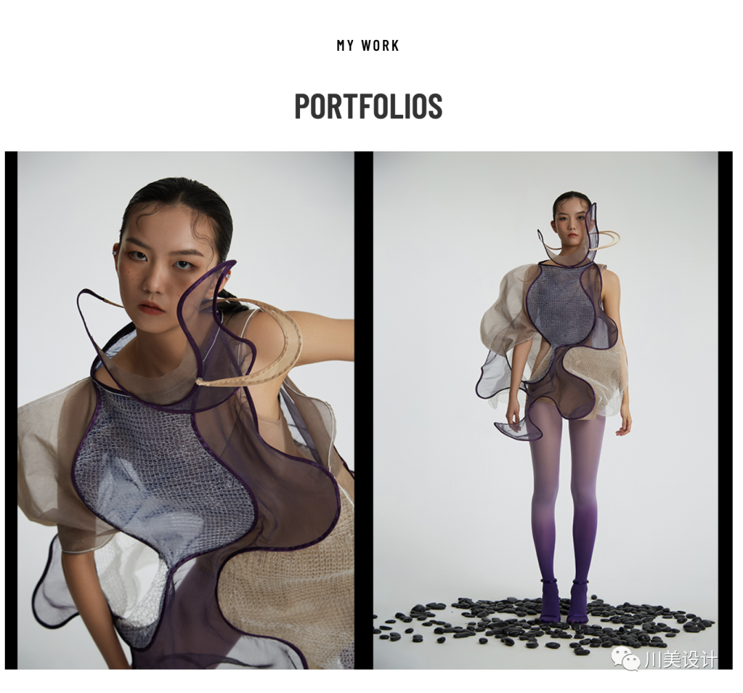 来源于传统草编与细胞,通过提取草编的编织方式与细胞的结构形态来进行创作。借助细胞的不同形态在服装廓形与造型结构上进行创新,以此来探索服装与人体之间的空间及穿插关系。
