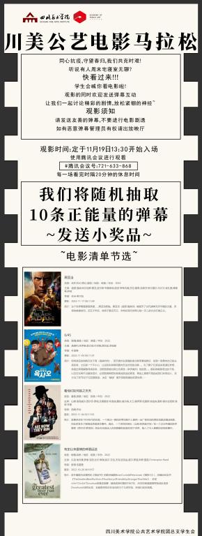 同心抗疫,共克时艰,守望春归。面对疫情,积极乐观的情绪、健康向上的心态也是一种强大的免疫力。为了丰富防疫期间同学们校园文化活动,满足同学们的精神文化需要,公共艺术学院开展了线上观影活动,通过观影品味电影中的百味人生,感受故事魅力,并期望借此活动鼓励师生携手抗疫,奔向春暖花开。