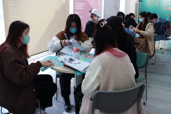 美术馆讲解志愿者们利用课余时间,以积极的态度,饱满的热情和专业的精神投身于讲解服务之中,为我校师生带来1天3场,6天共计18场的讲解导览。在“星汉灿烂:中国现代美术在重庆(1937-1949)”导览中,志愿者讲述了从1937至1949年重庆地区在美术创作、教育和展览等多个维度的整体面貌,描绘出指向中国现代美术的重庆美术地图。“从馆藏出发:时代质感——2021年万象城平台美术馆馆藏作品展”以20世纪的中国画、油画、版画、雕塑等藏品为主线呈现学院学科发展的脉络。除了讲解以外,本次“星汉灿烂”展览还配有观展游戏和趣味拼贴活动等常设公教活动,我校师生均可参与。师生们可在“星汉灿烂”导览游戏手册的引导下观看展览,并按照提示思考问题和完成任务,完成游戏手册后,可以在互动区域领取自然主题或人文主题“妙趣拼贴”的素材包,进行拼贴和绘画再创作。这一系列展览和公共教育活动将万象城平台乃至重庆地区的艺术发展脉络娓娓道来,在莘莘学子的心中埋下艺术的种子,在艺脉相承之中薪火相传。
