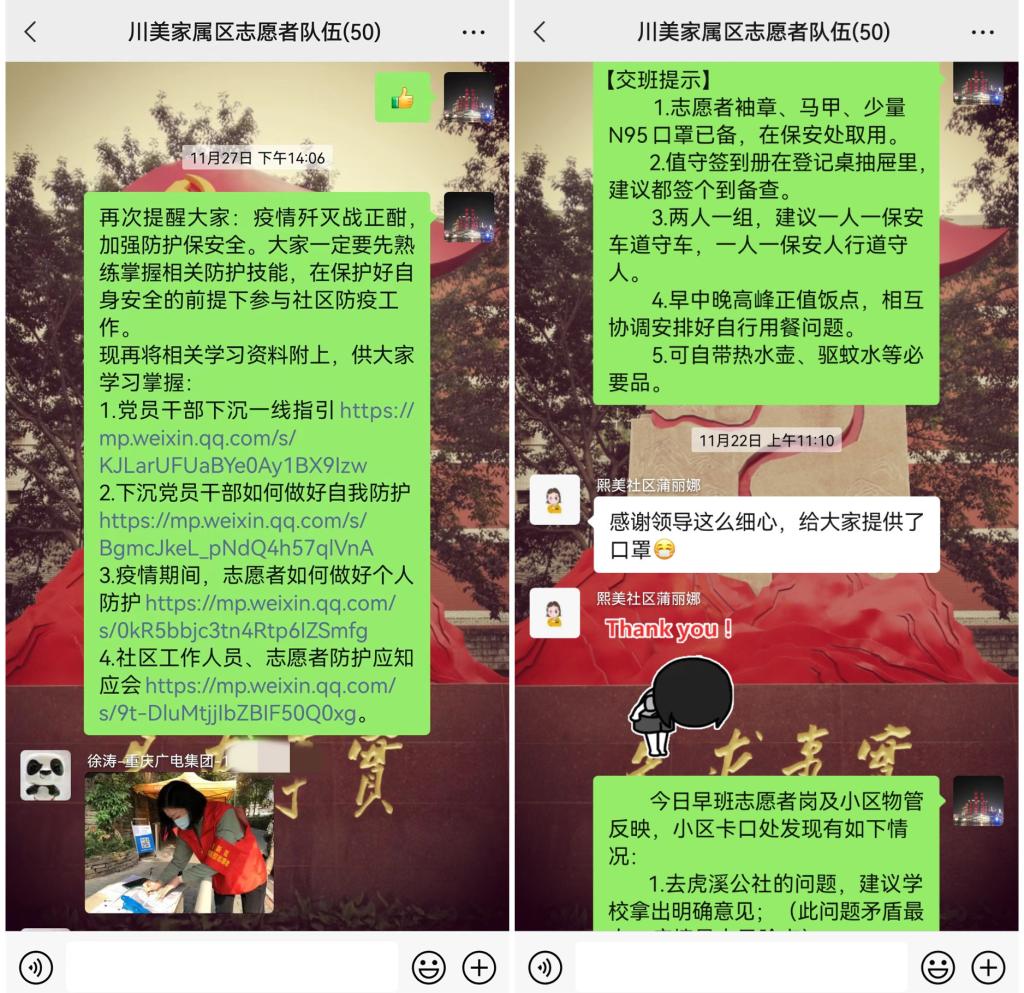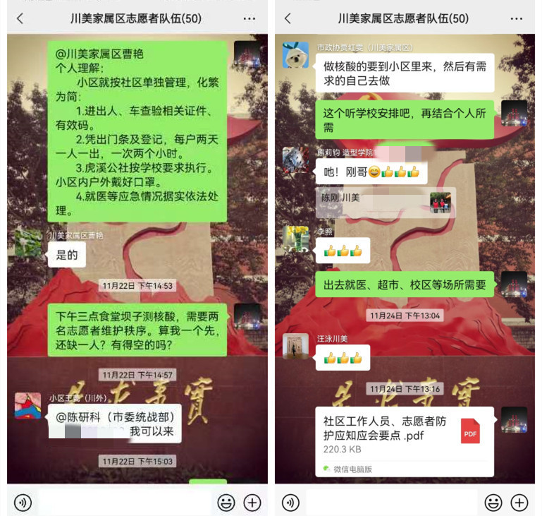 志愿者们克服线上办公、教学以及线下照顾老人、小孩上网课等实际困难,在做好自身防护基础上,协商一致从11月22日起,一日三班、两人一组、排班签到,在早、中、晚三个高峰时段,轮流值守住宅小区门岗,开展进出门凭证登记、扫码查验、提示劝导、政策解释、辅助老人等志愿服务。在小区开展核酸检测时,主动安排志愿者参与现场秩序维护等工作。在整个志愿服务工作中,大家任劳任怨、协同配合,切实增进了相互理解、增进了邻里和谐、增进了多方配合,得到了校方、物管方、业主们的认同好评。志愿者们表示,“川美是我家、防疫靠大家,支持小区防疫,既是守护自己的家园,也是对家属和学校工作的最大支持!我们不怕艰难困苦,请在校区工作的家人们安心、放心。”
