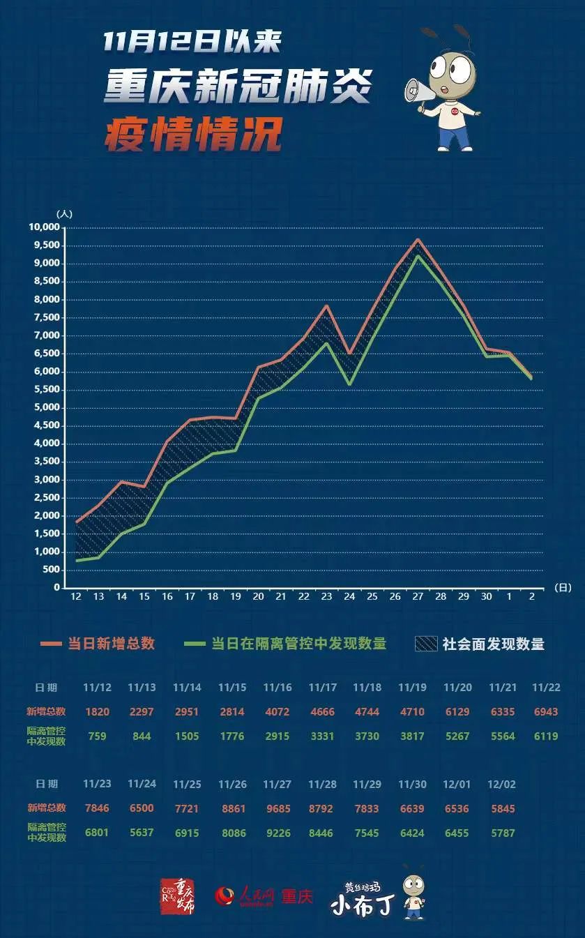 12月2日,全市报告新增感染者5798例(不含由无症状感染者转确诊病例的47例),较前一日减少674例,主要集中在高风险区和集中隔离点。中心城区新增报告感染者4960例,中心城区以外区县新增报告感染者838例,分别较前一日减少460例、214例。九龙坡区、渝中区、江北区、渝北区等4区共报告新增感染者3760例,较12月1日减少272例;梁平区报告新增感染者209例,较前一日减少98例。