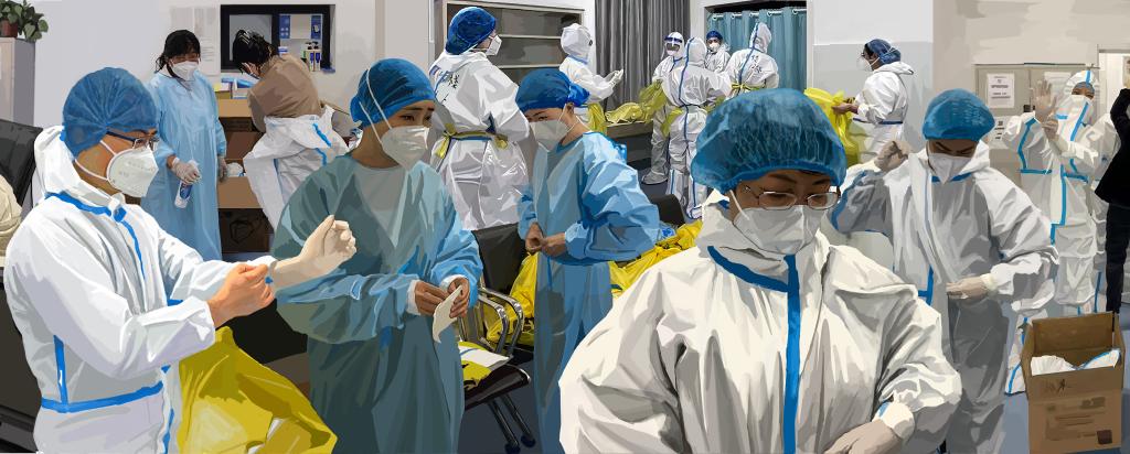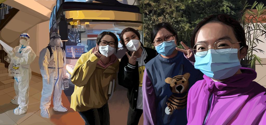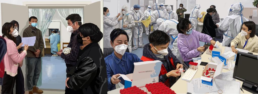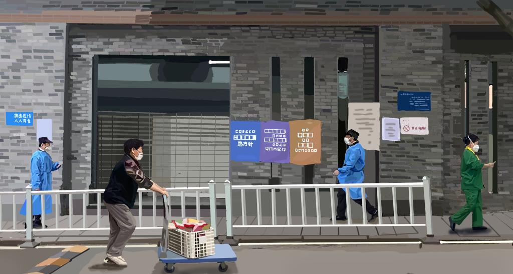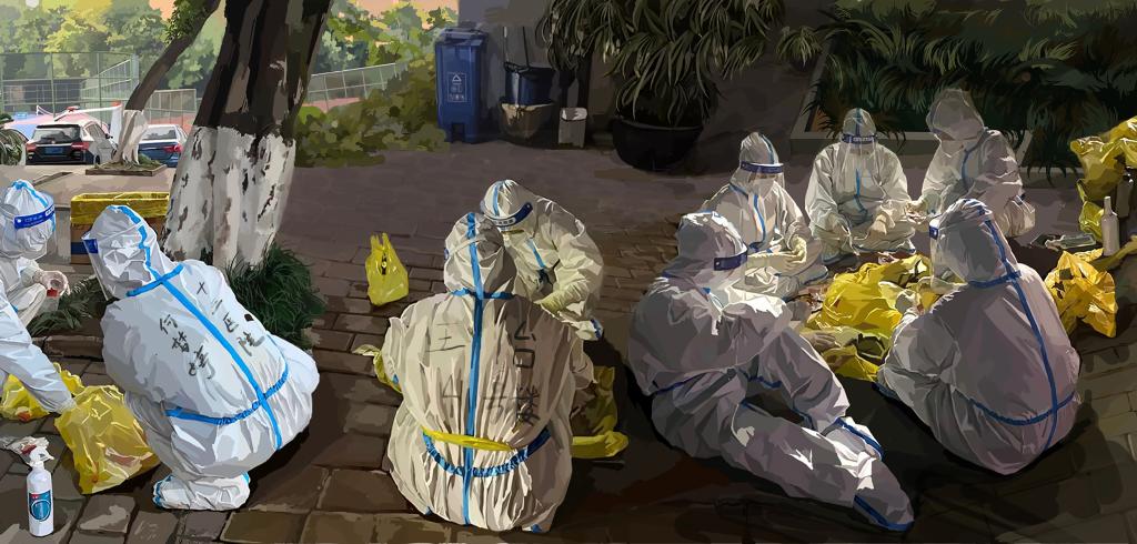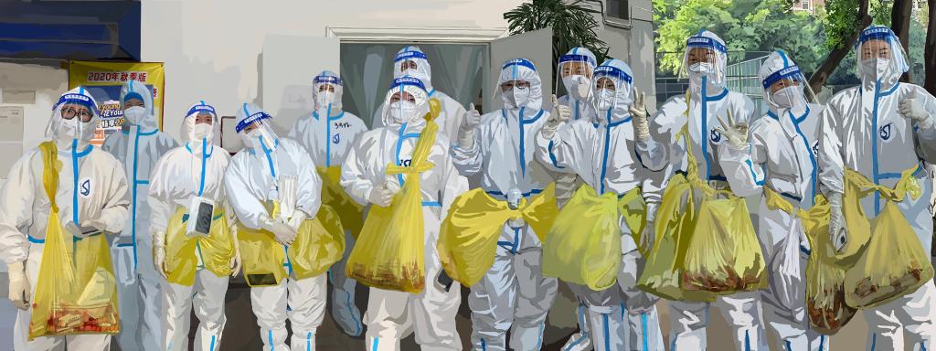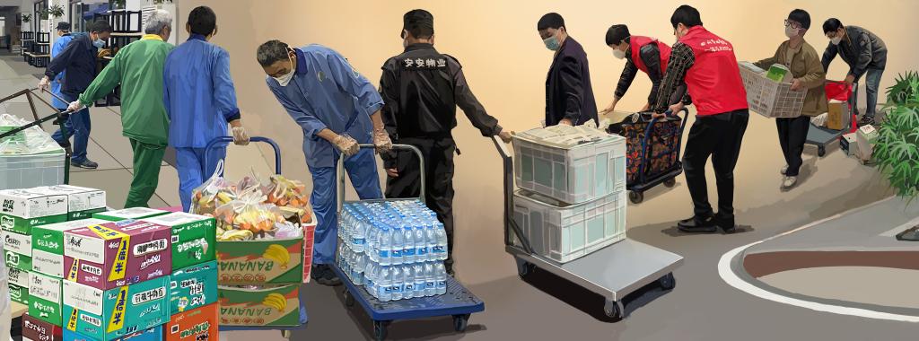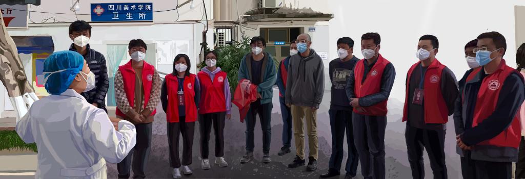 2022年11月,新冠病毒悄悄潜入校园,学生混管阳性的消息,彻底让学校疫情防控应急指挥部和工作组的老师们紧张起来。学生足不出户,物业、安保、老师、行政等各类工作人员走进食堂,打包送到宿舍门口,为学生们提供一日三餐的基础保障。核酸检测人员敲开每间宿舍,扫码确认采核酸。志愿者团队帮助学生采购画材、生活用品、快递等等。这些看似平凡的工作离不开坚守岗位的指挥人员、医护人员、物业人员、教师志愿者等等。公共艺术学院教师刘凯作为志愿者队伍中的一员,每日参加核酸扫码、打包送饭、运送物资等工作,结合所看到的场景,利用休息时间积极带领壁画艺术项目工作室的学生们(李安琪、鲁思雨、张心怡、赵茜、崔彦妍、张欣、何栩溦、王江庆、郭奕岭、陈诗琪、李宣仪、张冉、唐玉星、杨怡纯),拿起画笔,用心用情记录下默默无闻的校园守护者。