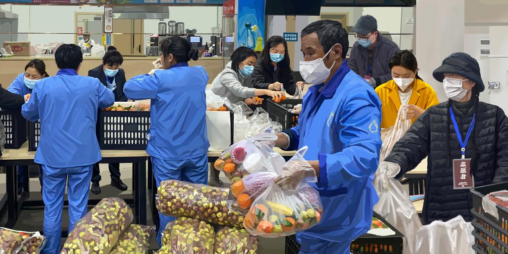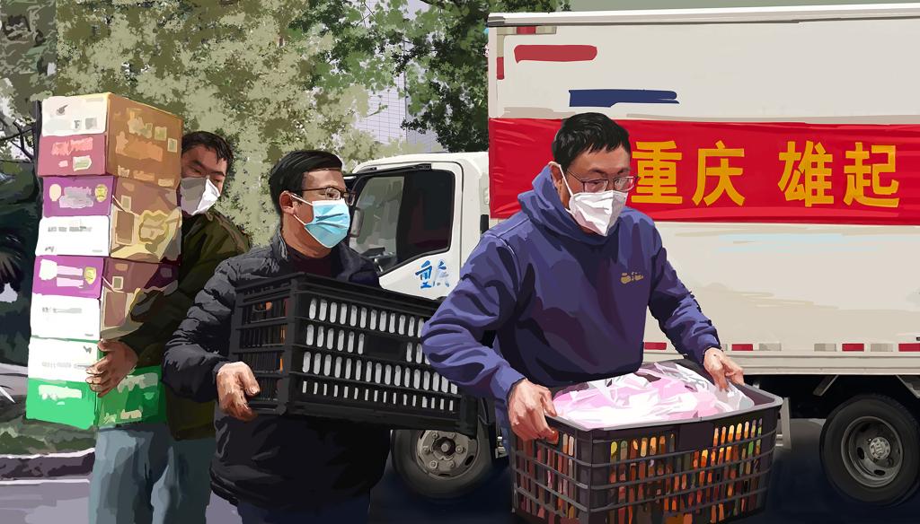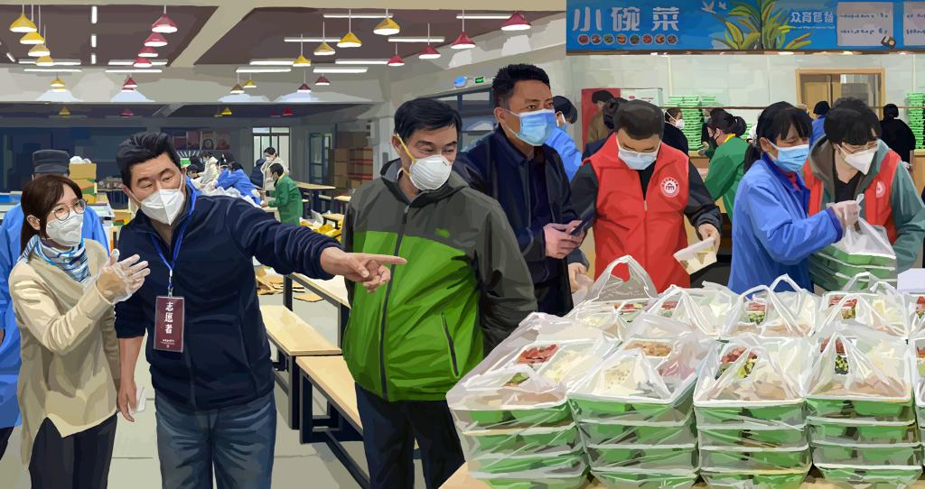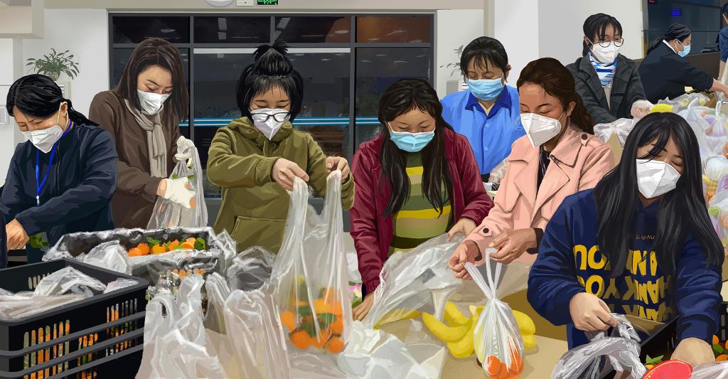 画面采用长卷形式将校园的故事娓娓道来。门口的保安守卫着进入校区的最后防线,工作人员各司其职,领导们巡视校园,宿舍人员听取工作指示;物业人员协作将筐中物品运转指挥部;大学城校区逆行而来的党员志愿者们抬着沉重的物品走向学生宿舍;运输物资的车辆打出“重庆雄起、抗疫有我”的口号,看着一箱箱沉重的水果,大家都是志愿者,争先上前搬运物资;校领导来到食堂视察,检查为学生准备的各类水果食品等。水果袋中品种丰富,枣、梨、苹果、橘子、香蕉等等,大家流水作业完成专属自己的任务。盒饭同样也是打饭菜、包装、点数、运输的流水线工作,物业人员紧紧抱着两摞盒饭,生怕会洒出来;不同的食品物资共同汇向了学生宿舍,等待着宿管阿姨和志愿者们的上门发放。