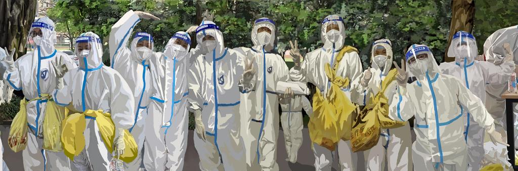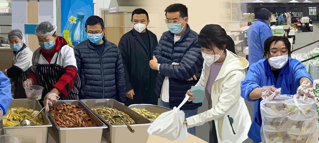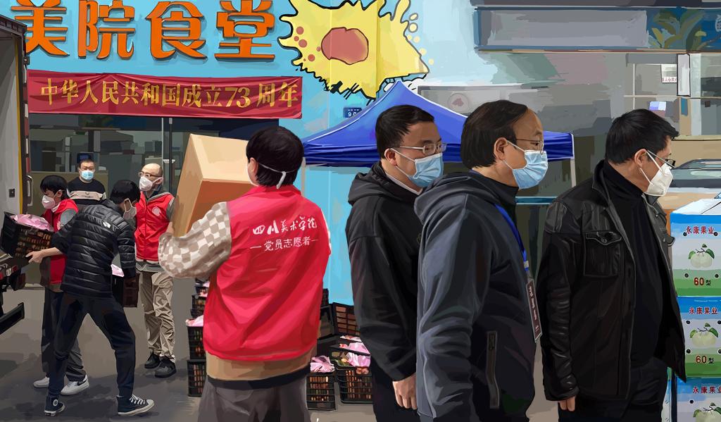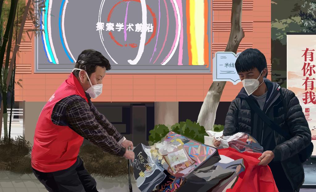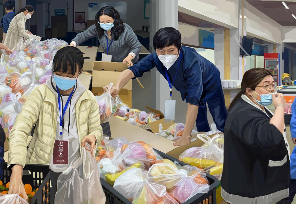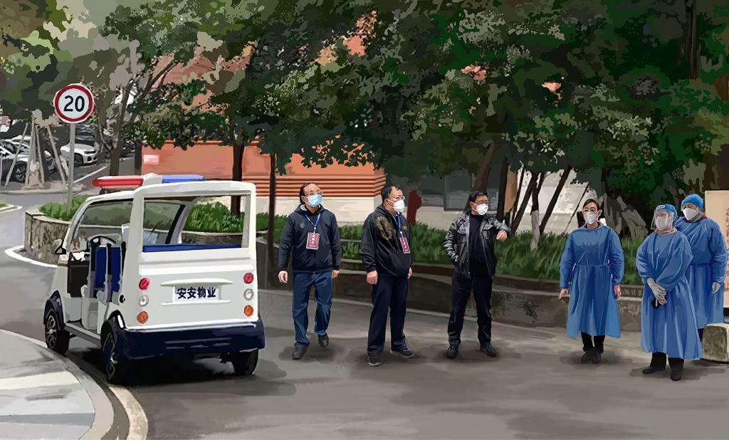 日常岗位上的清洁工、电工、保安、领导、专家、老师等等,面对突如其来的疫情,刘凯和学生的画作中只有恪尽职守的志愿者,信念坚定的校园守护者。他们将此画献给为学校努力付出的人们,感恩大家团结一致齐心协力的付出,传递着爱与暖心的一个个瞬间,寄予着万象城平台越来越美好的期望。