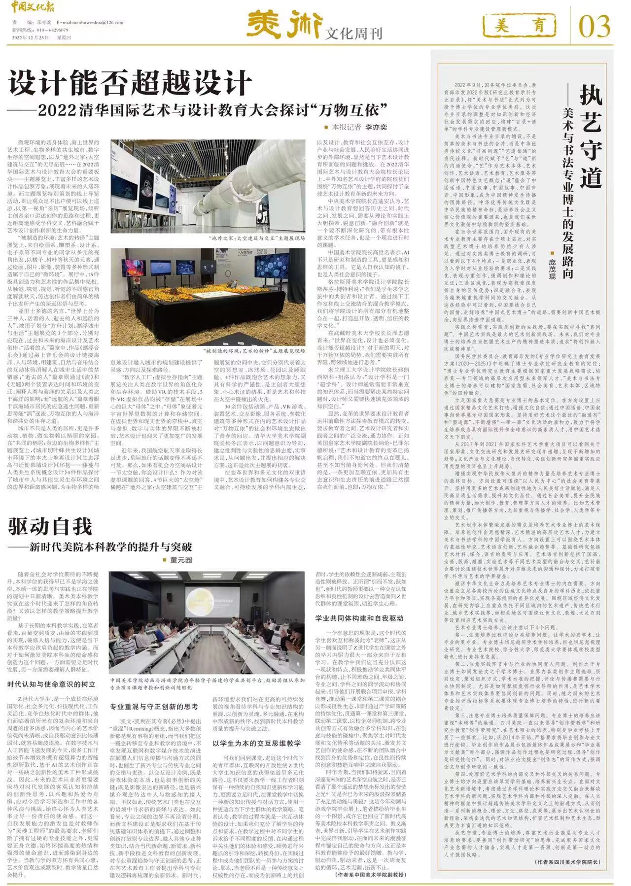 2022年12月25日,《中国文化报》第3版刊发了我校庞茂琨校长署名文章《执艺守道——美术与书法专业博士的发展路向》,文章为中国开启艺术专博时代贡献了川美经验。