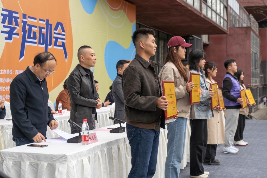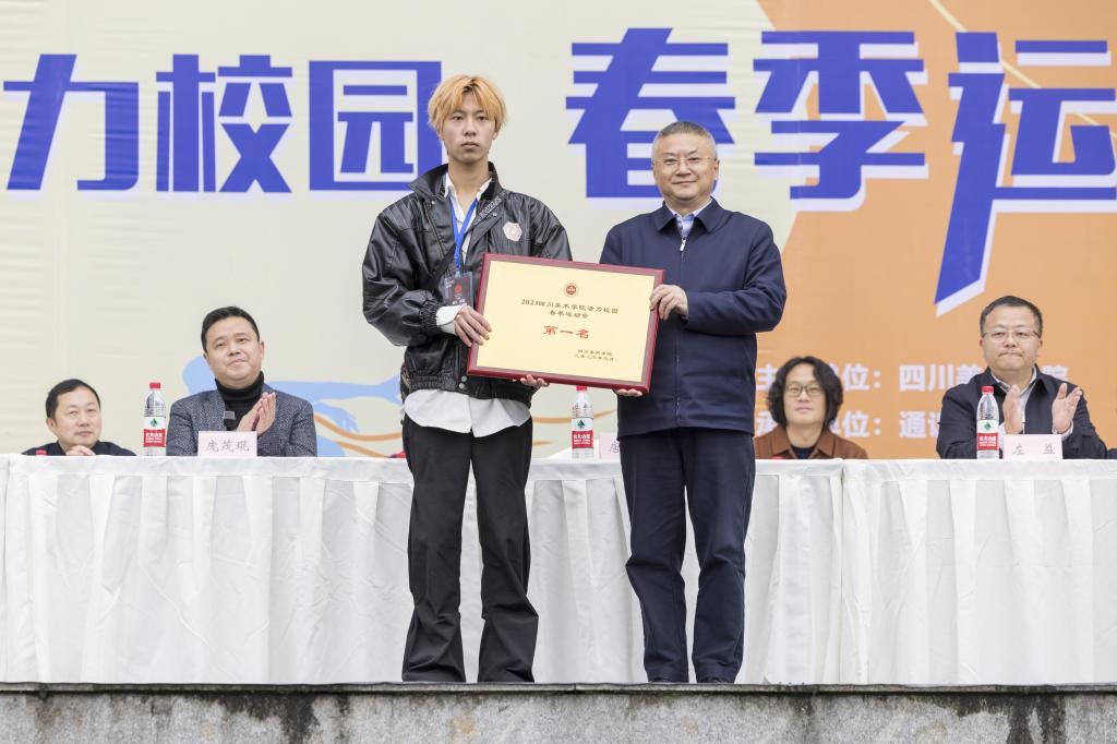唐青阳为获得2023年活力校园春季运动会团体总分第一名的公共艺术学院颁奖,庞茂琨为获得团体总分第二名的造型艺术学院颁奖,左益为获得团体总分第三名的设计学院颁奖。
