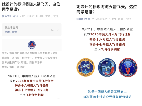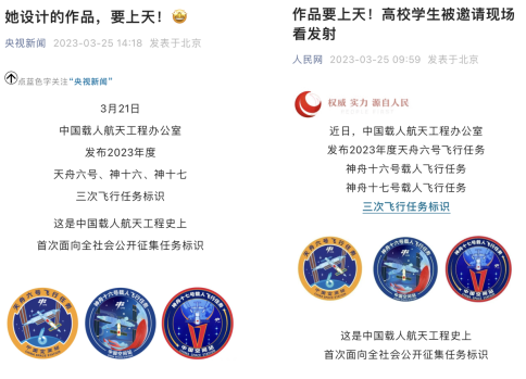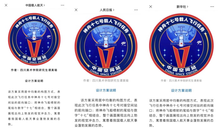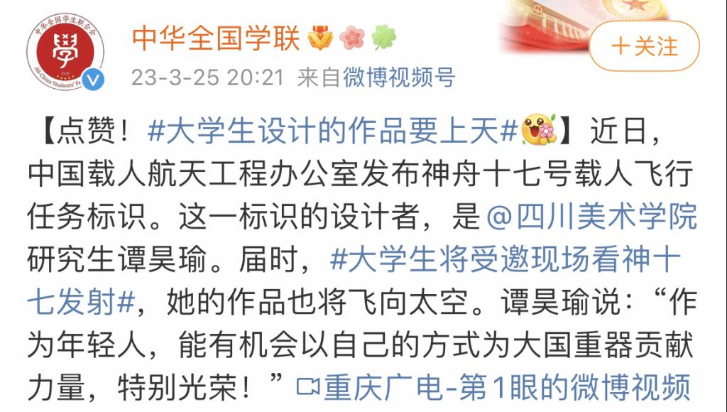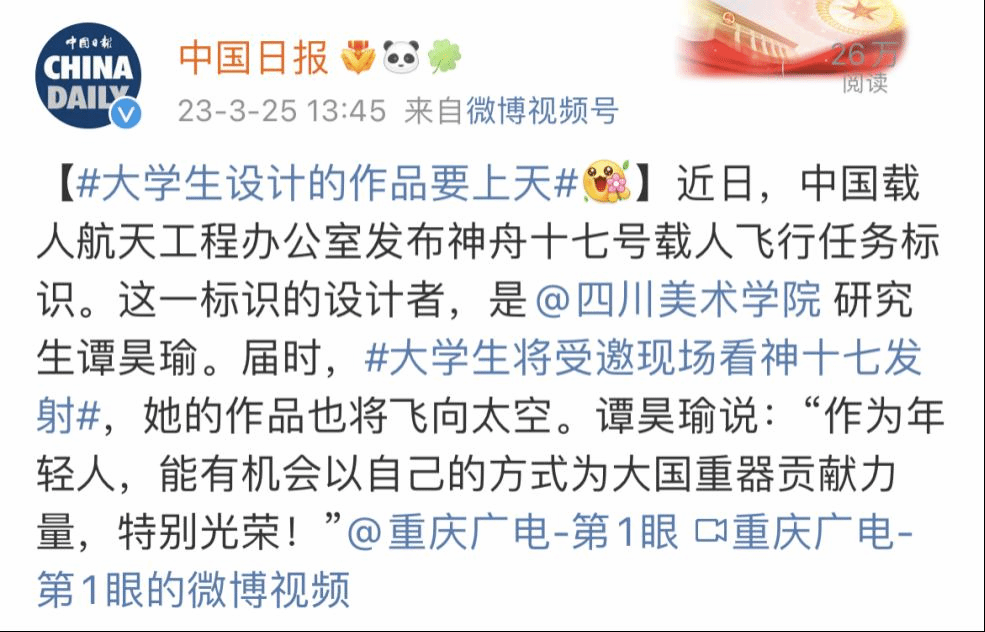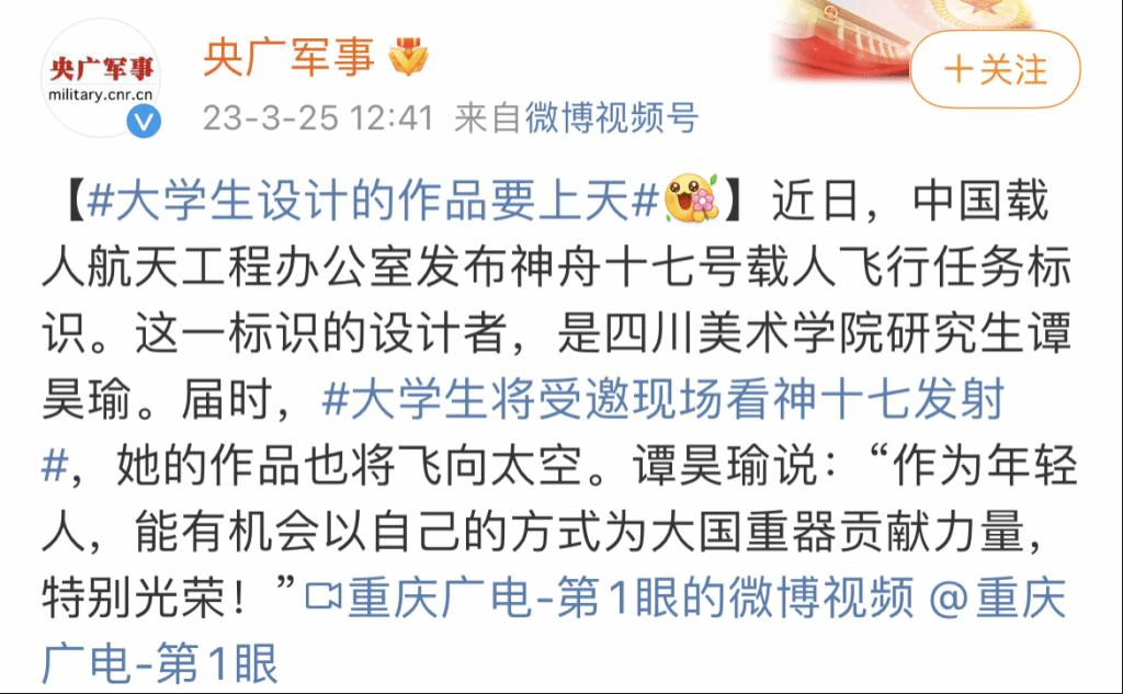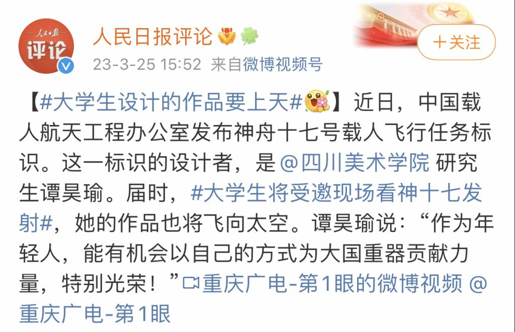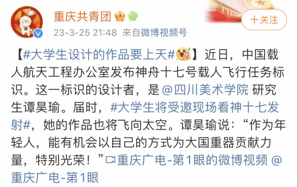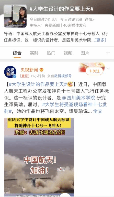 微博和抖音上,与川美学生设计的神舟十七号载人飞行任务标识相关话题登上热搜榜。其中,仅央视新闻发布的“大学生设计的作品要上天”话题,阅读量接近1000万,人民日报评论、中国日报、央广军事、中华全国学联等40余家媒体微博进行转载评论。