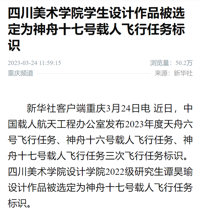 3月21日,中国载人航天工程办公室发布2023年度天舟六号飞行任务、神舟十六号载人飞行任务、神舟十七号载人飞行任务三次飞行任务标识。我校设计学院2022级研究生谭昊瑜的设计作品被选定为神舟十七号载人飞行任务标识。公告发布后,人民日报、新华社、中央广播电视总台、光明网、重庆日报、华龙网、上游新闻等媒体纷纷转载。