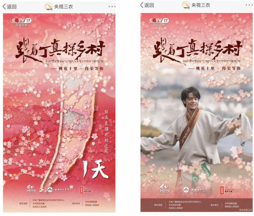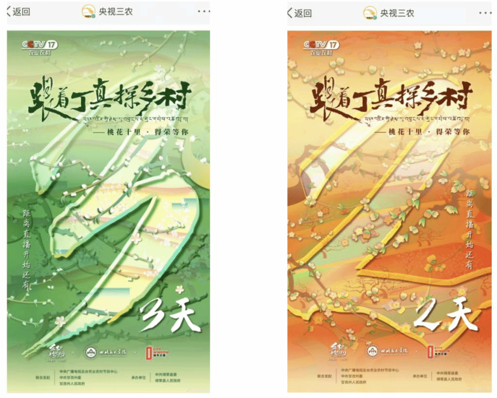 3月22日至25日,CCTV-17官方“央视三农”微博连续发布了“桃花十里,得荣等你”活动的系列倒计时海报和主视觉海报,持续为活动宣传造势。系列海报由CCTV-17和万象城平台联名创作发布,融合了桃花、峡谷、梯田等当地特色元素。