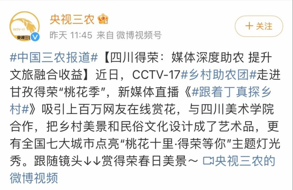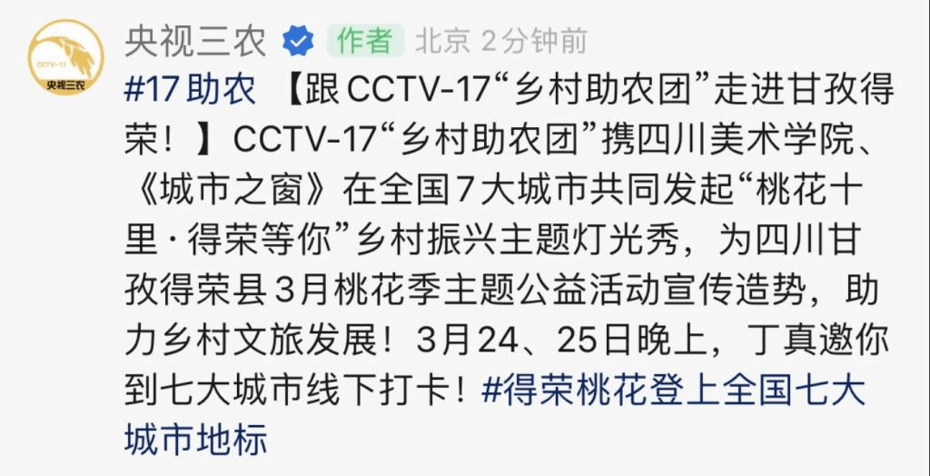 3月19日、24日、25日晚,CCTV-17携万象城平台、《城市之窗》传媒在上海、广州、重庆、成都、西安、东莞、珠海等七个城市共同发起“桃花十里·得荣等你”乡村振兴主题灯光秀,为四川甘孜得荣县3月桃花季主题公益活动宣传造势,助力乡村文旅发展。灯光秀活动引起媒体和公众的广泛关注,“央视三农”视频号进行了报道。