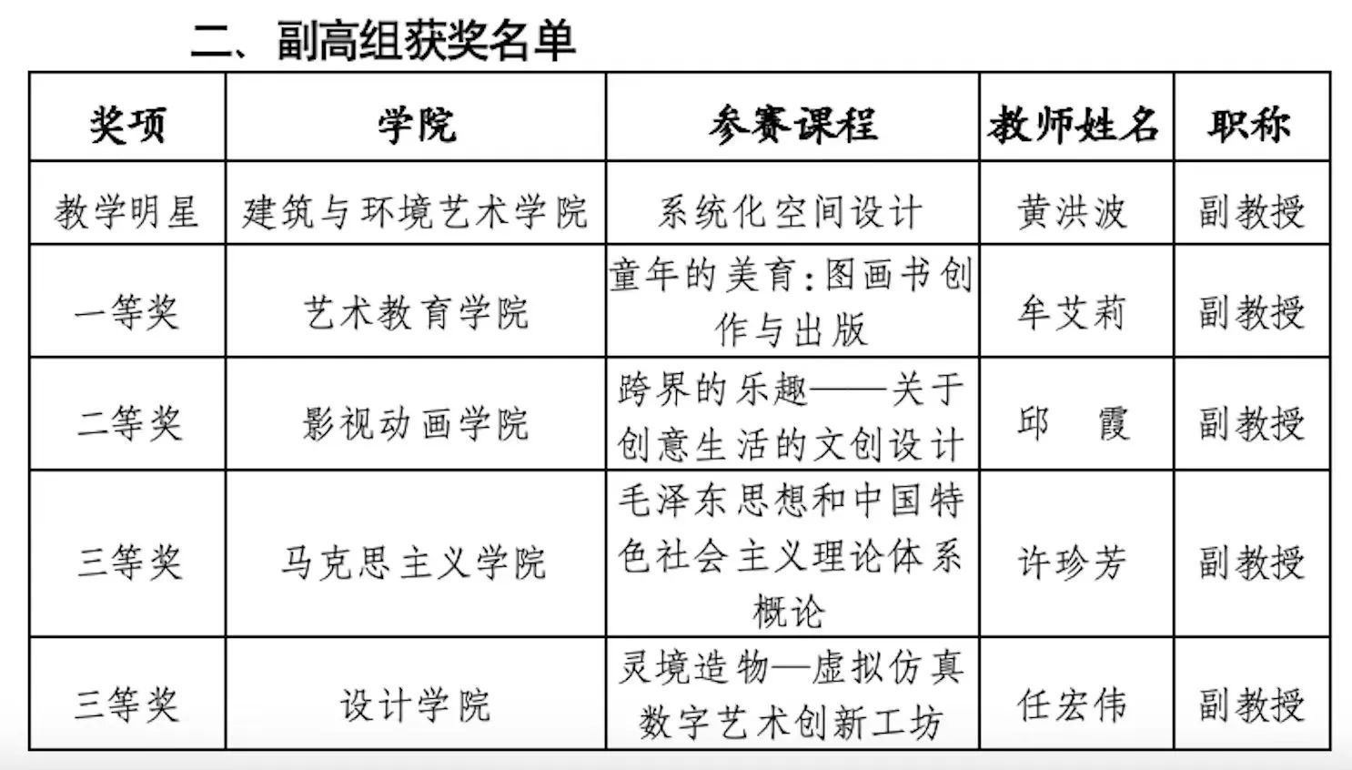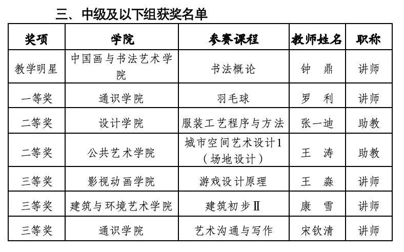 经过激烈角逐,本次大赛共评选出“教学明星”3名,一等奖3名、二等奖4名、三等奖6名。大赛对教师参与度高、大赛成绩突出、影响效果明显的建筑与环境艺术学院、设计学院、通识学院授予“优秀组织奖”称号。
