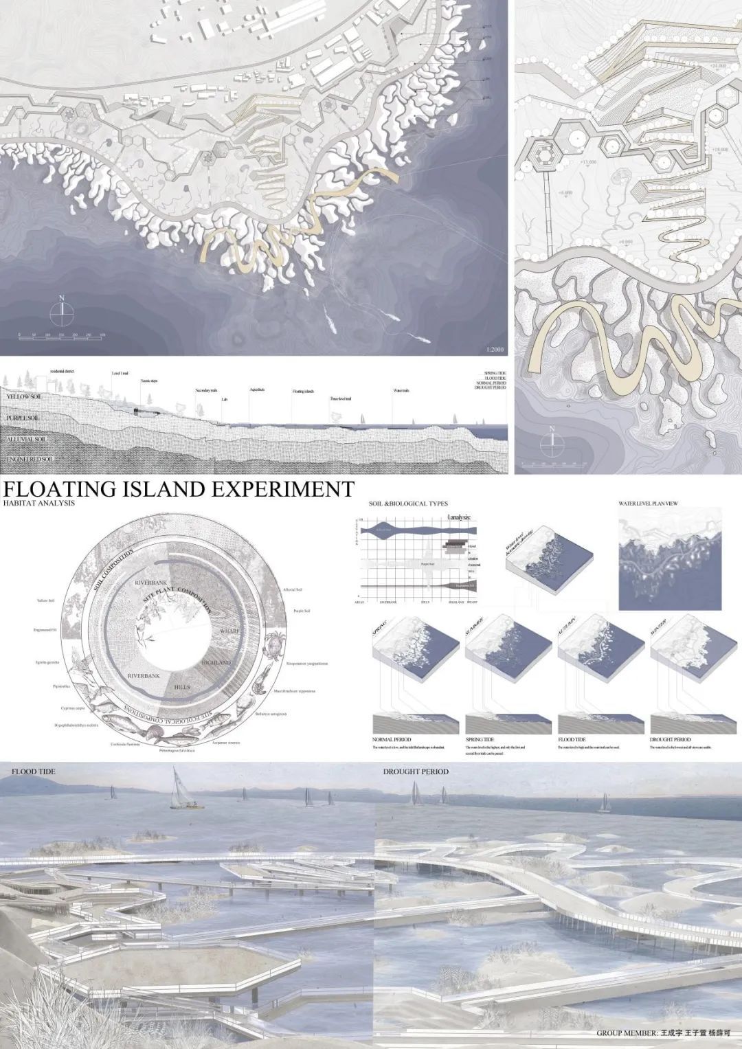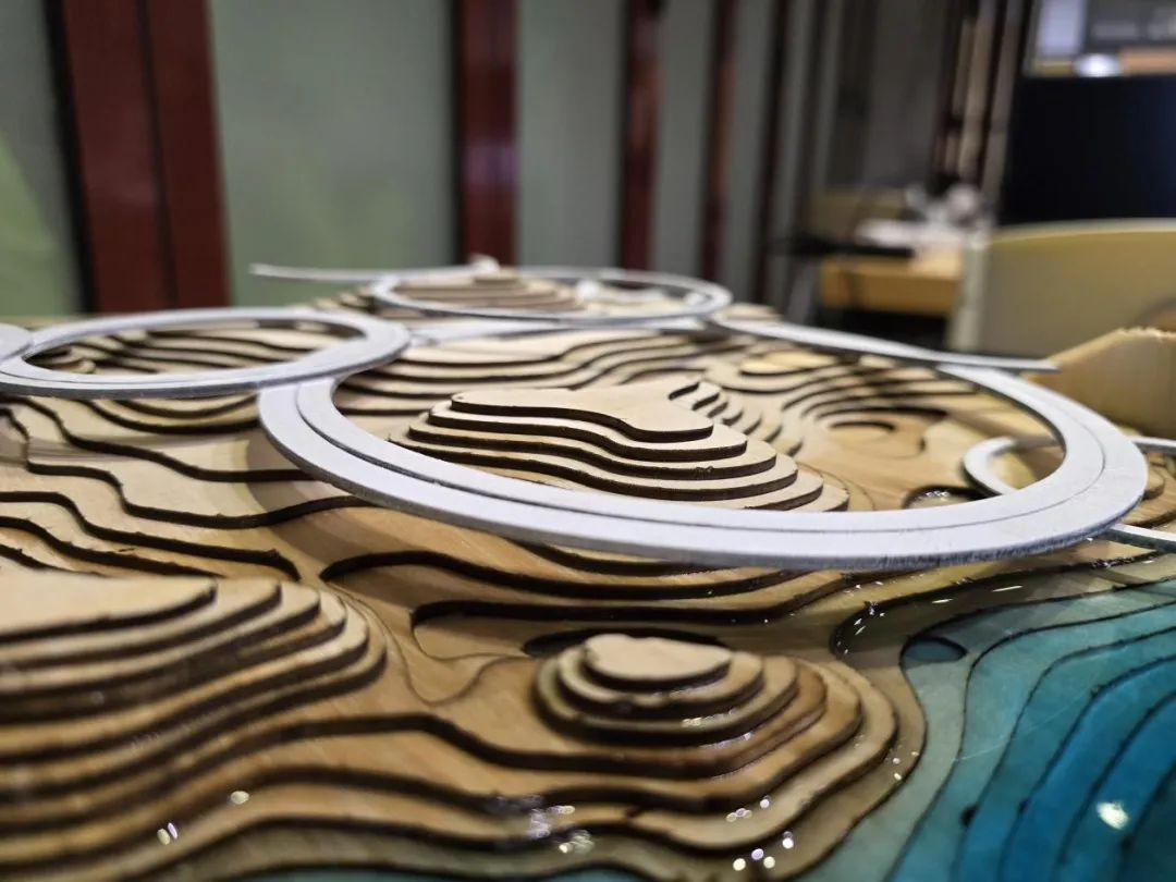 我们主要的设计方向是聚焦于人和场地的互动性,比如一个想做的主题是让人24h能亲水观水,所以做了很多将人从内陆引入滨江的道路,但是我们又希望人亲近水的同时,水也能自己去靠近人的空间,我们通过原有的河流素材概括了横向的湿地斑块,所以联想到在特定的节点做湿地空间,来配合不同季节的水位,消解了传统江岸轮廓的同时,引入较柔和的江水,然后我们不仅做了一些架空的观水廊道,还设置了下沉的广场空间,能够适应场地高差的同时,触碰到不同水位的江水,下面我们的模型配合亚克力做了两个不同季节水位的展示,以表现季节变化的湿地空间特征。