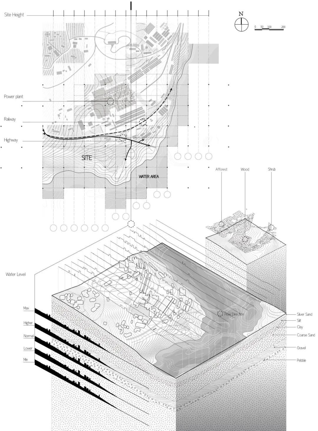 第二阶段:探索水作为催化剂如何塑造影响地形以及地形对水文的反作用。将提取出来的原型进行地形设计,探讨地形与水文关系,并进行场地标准化设计。同时开始制作手工模型和学习mapping图纸制作。
