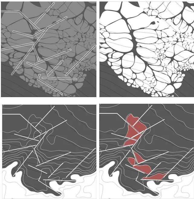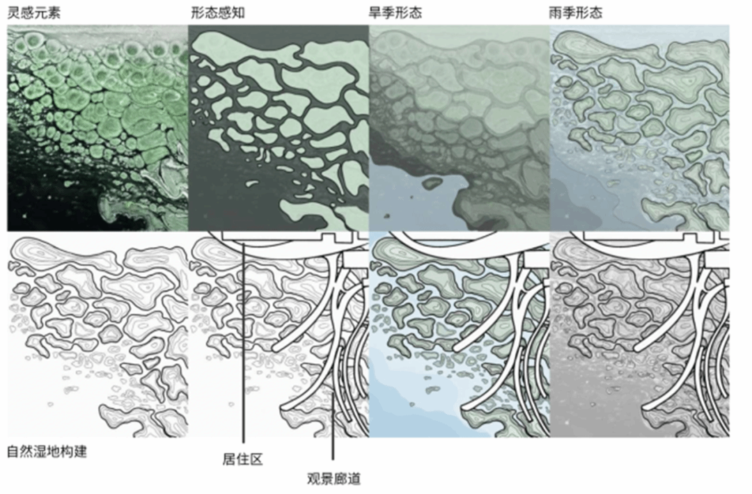 考虑到水文节律中的季节性水位涨落与单日内的潮汐变化,不同海拔高度的沉积池中,会留下不同季节、年份的沉积物,沉积的数量、成分与位置也会随着水文条件而改变,进而让水文变化带动景观的动态变化,在场地中留下潮汐的记忆。
