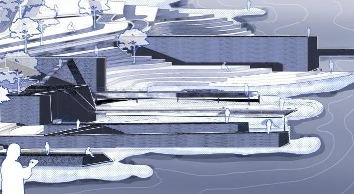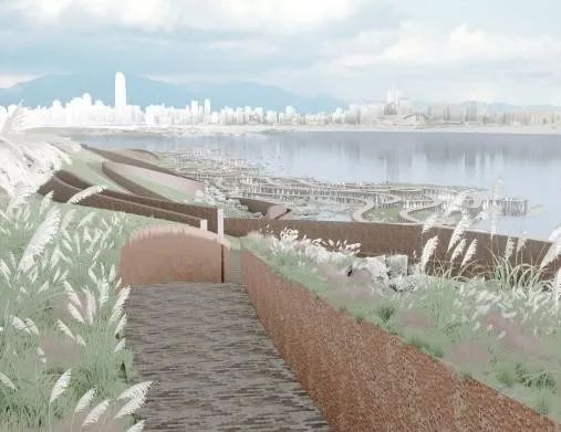 本设计以水波纹肌理为灵感,通过起伏的景观廊道与地形重塑再现江水侵蚀滩涂的动态过程。主廊道沿潮汐线构建层次空间,底部微地形创造亲水路径,顶部观景台形成立体观演剧场。砂石雕塑群与大地艺术土丘结合绿道系统,串联居民区与开放节点。设计通过高差变化使人直观感受水位涨落,硬质平台与自然肌理交织,营造上下层空间对视互动,既延续滩涂萧瑟