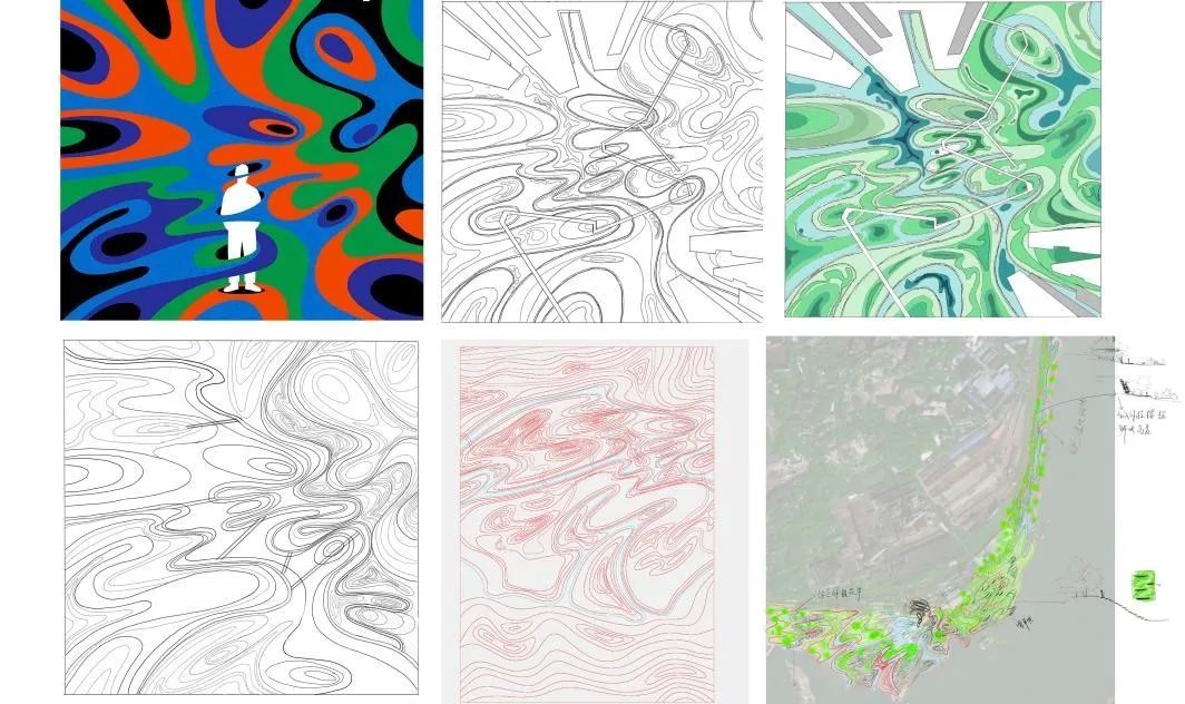 滩涂场地性质极为特殊,其土壤松软,水位受潮汐精准调控,时刻演绎着大自然的节律。通过欧普艺术画作,对画作中流动的曲线进行提取、重组、排列设计出规律图案在对场地的实际情况如高差、水位等进行考量。秉持生态优先,融入防潮固堤守护安全、生态修复厚植生机。在夏季突遇涨潮可在场地的廊架空间观赏玩耍,洪水退却又可下至滩涂空间,实现多季节也可以进入到滩涂空间。