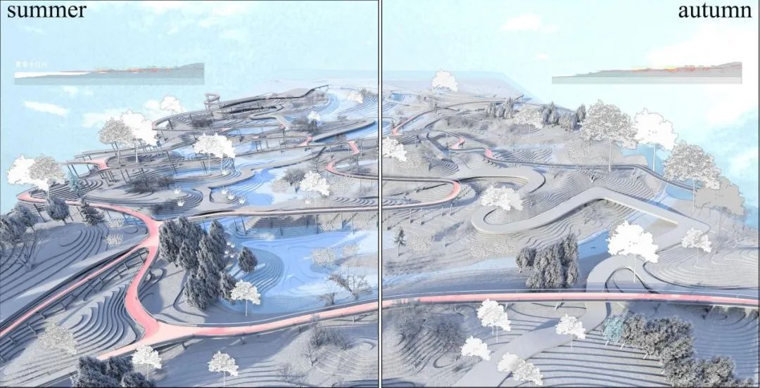 设计利用江水不同的水位营造不同的季节性景观,利用地形的凹凸起伏制造视线和游经的变化,以此来模糊人对自然和人工边界的感知,设置一系列如下沉步道,镜面水等节点来凸显场景的精神性所在。