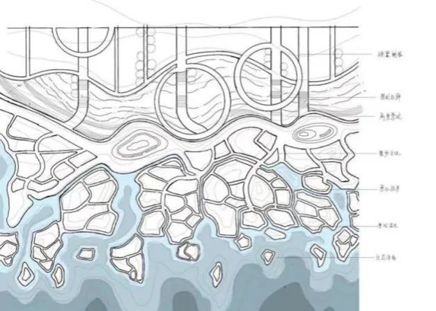 要素提取:退去时留住沉积物,但挡墙的空隙可让潮水自由通过,进而形成一处沉积区域,可供一些水生植物生长,形成聚拢型的植物群落。