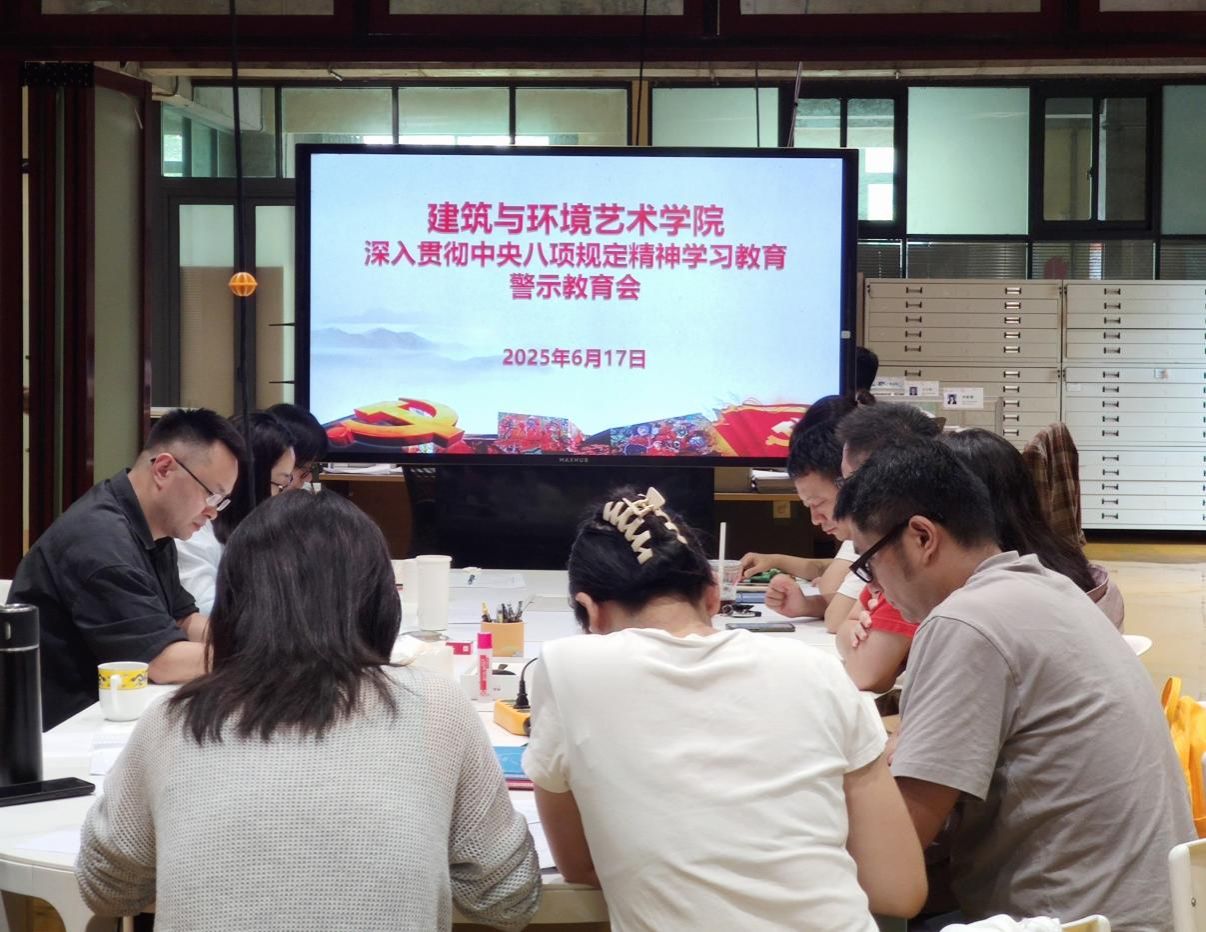 2025年6月17日下午,建筑与环境艺术学院召开深入贯彻中央八项规定精神学习教育警示教育会。全体教职工参会,学院党委书记刘建峰主持会议。