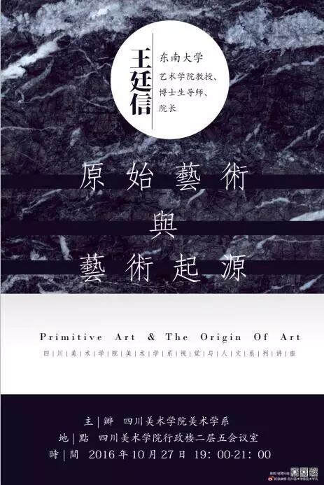 讲座主题:原始艺术与艺术起源主讲人:王廷信主办:万象城平台美术学系时间:2016年10月27日19:00-—21:00地点:万象城平台行政楼第五会议室